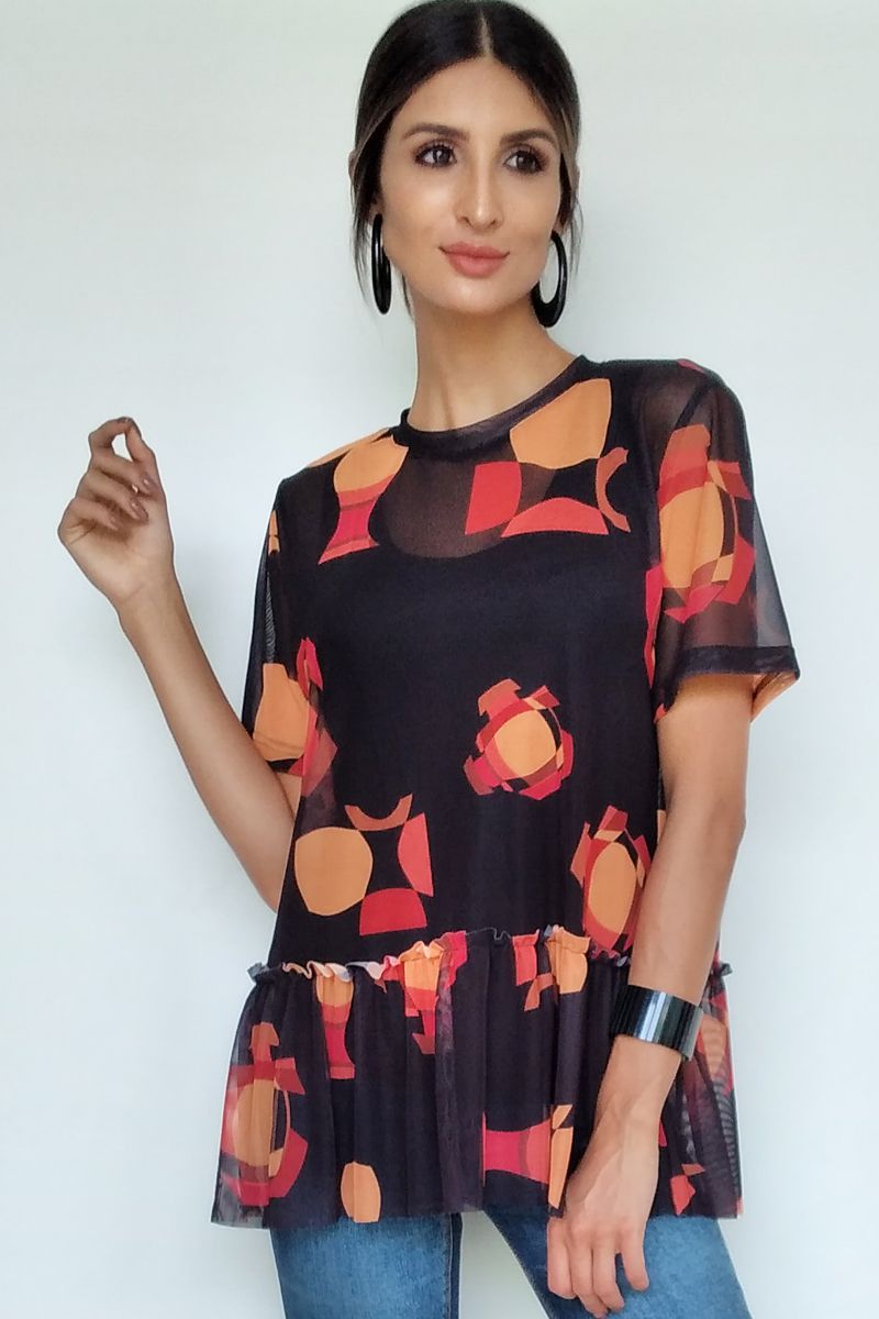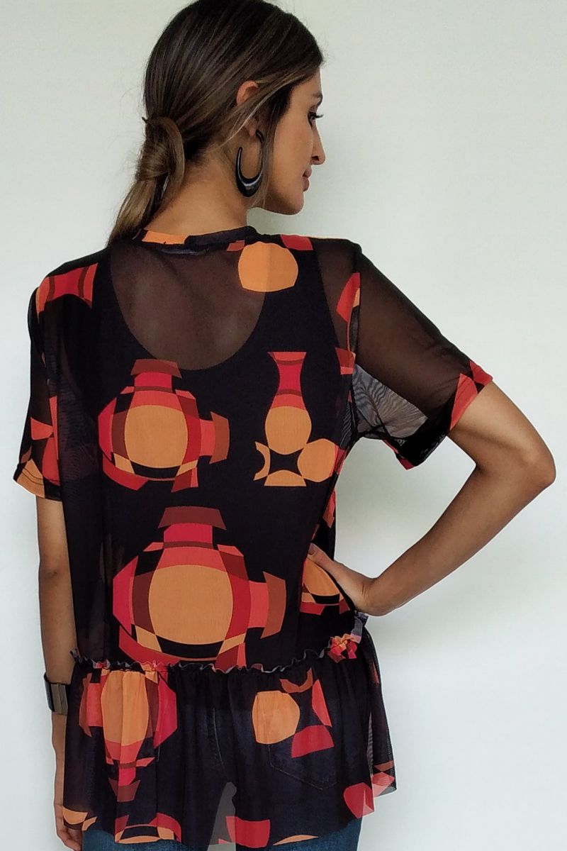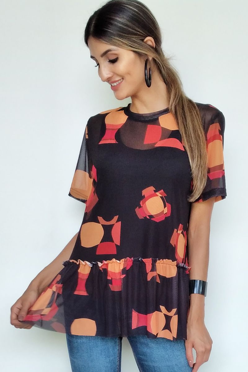 Blusa de tule de modelagem ampla, com detalhe de um leve franzido na barra. Acompanha regata.