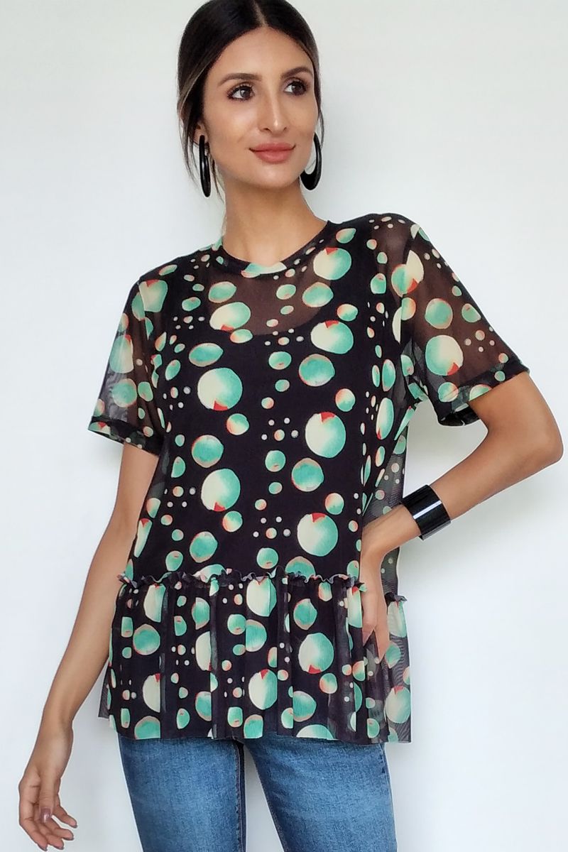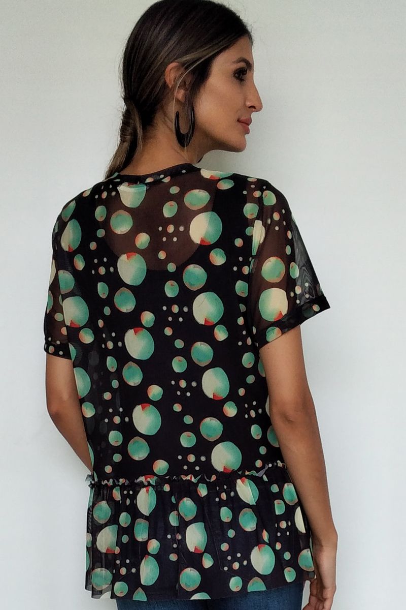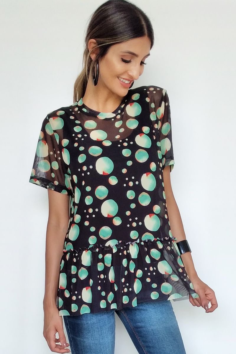 Blusa de tule de modelagem ampla, com detalhe de um leve franzido na barra. Acompanha regata.