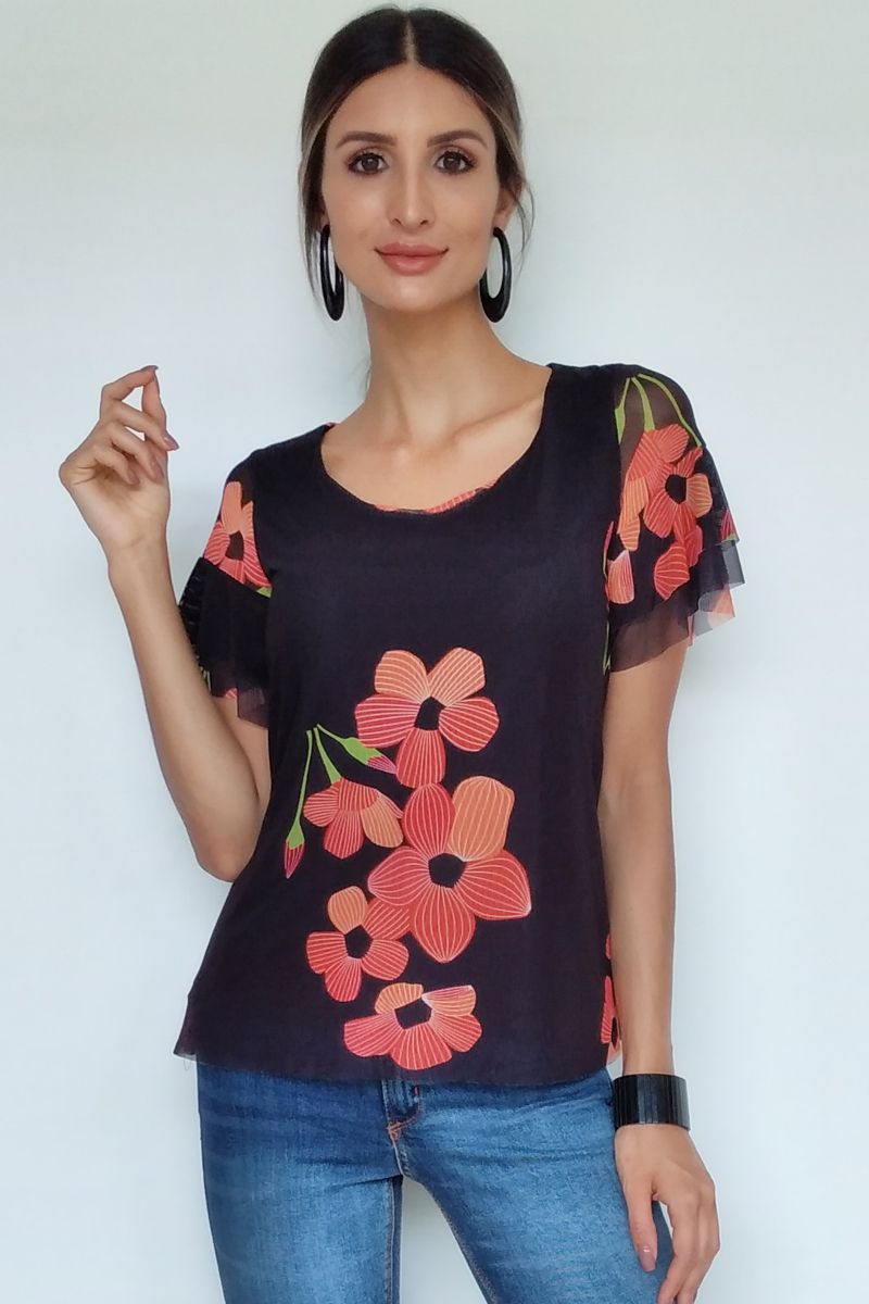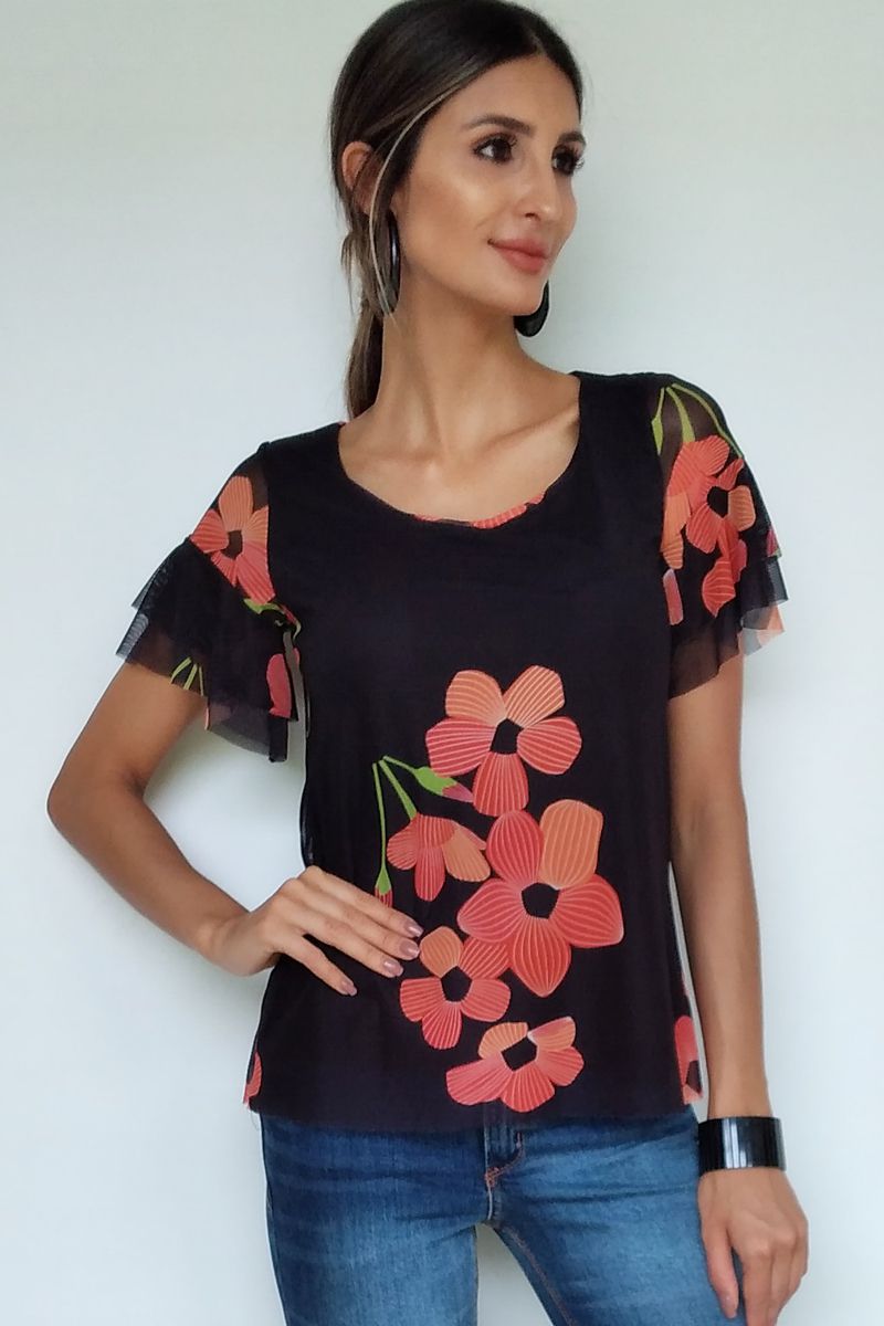 Blusa de tule básica com mangas em duas camadas /343BRJ-112