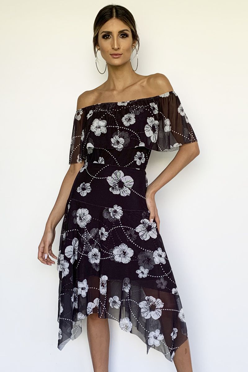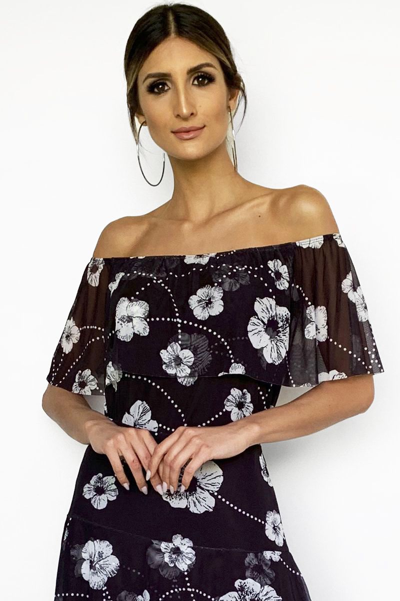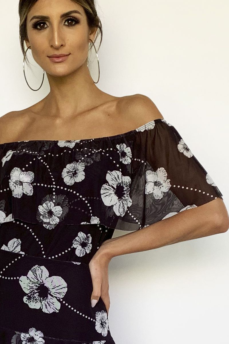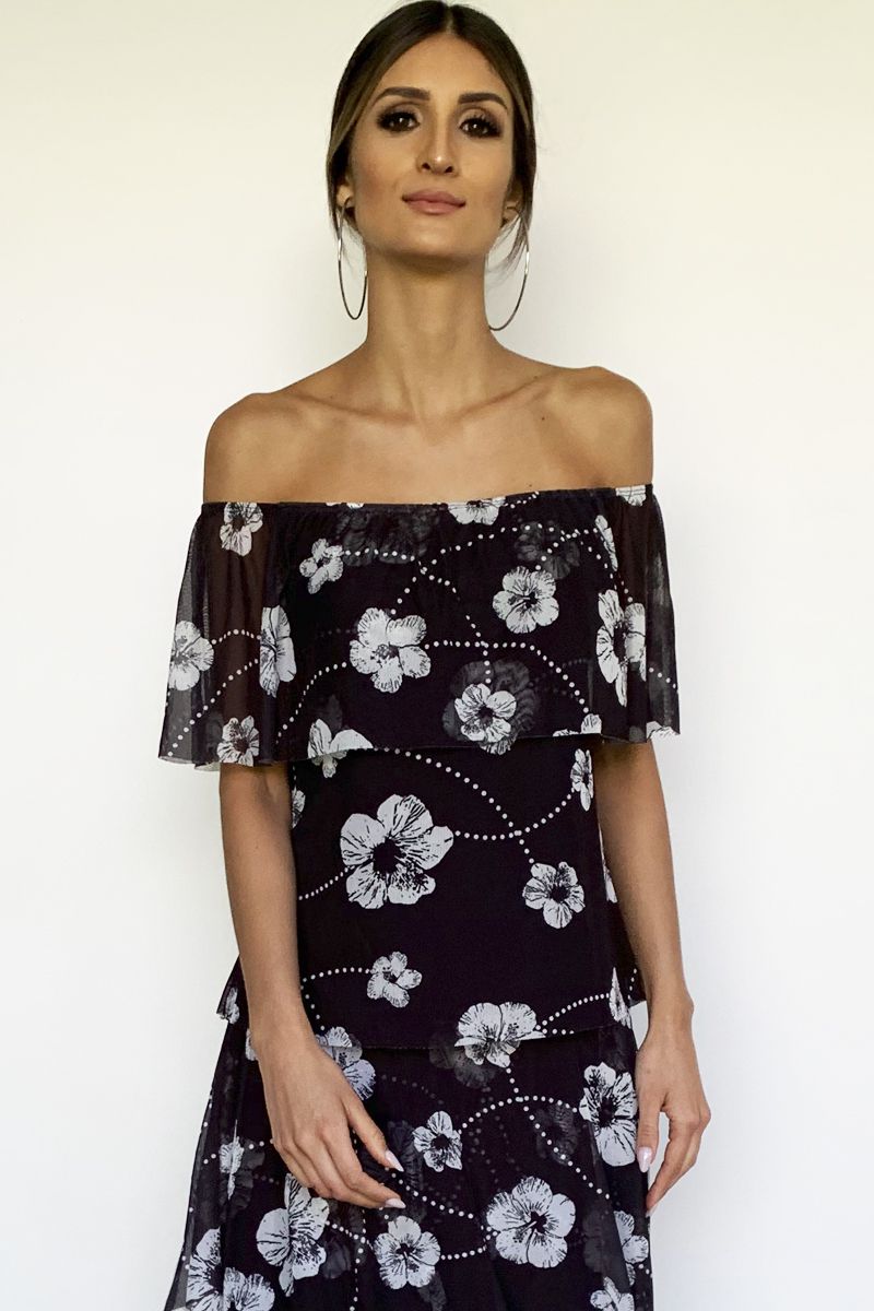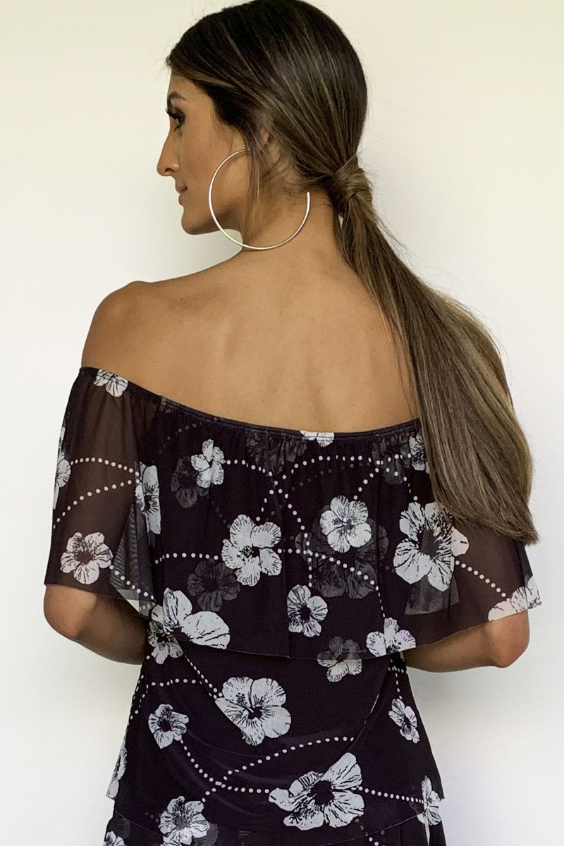 Blusa de tule sem alças, deixando os ombros à mostra, com lindo babado no decote