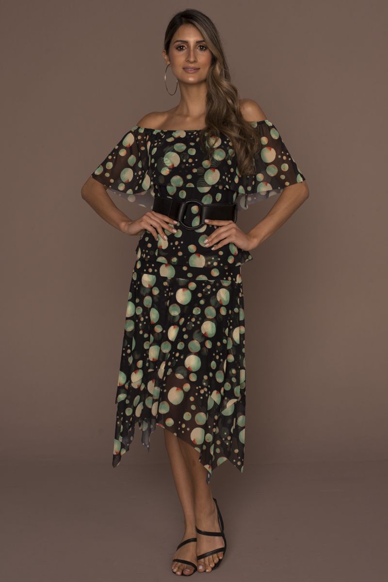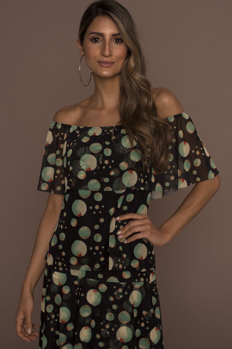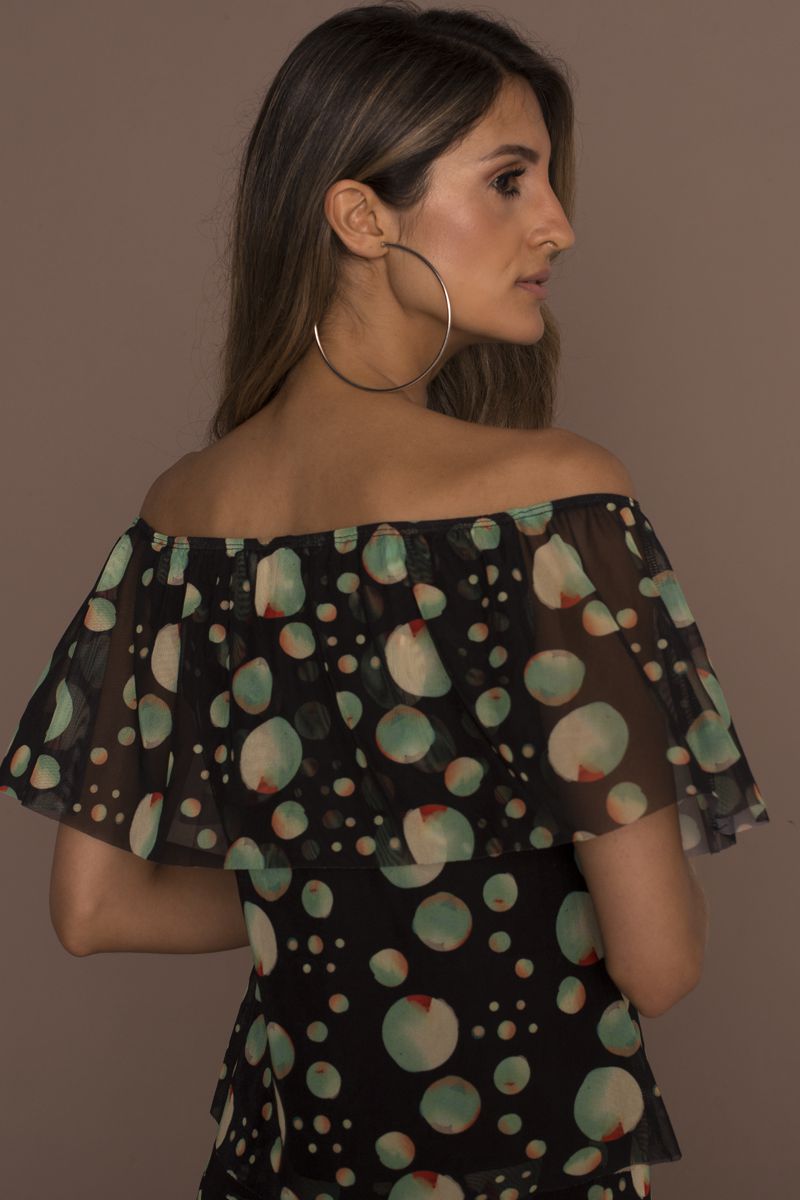 Blusa de tule sem alças, deixando os ombros à mostra, com lindo babado no decote