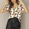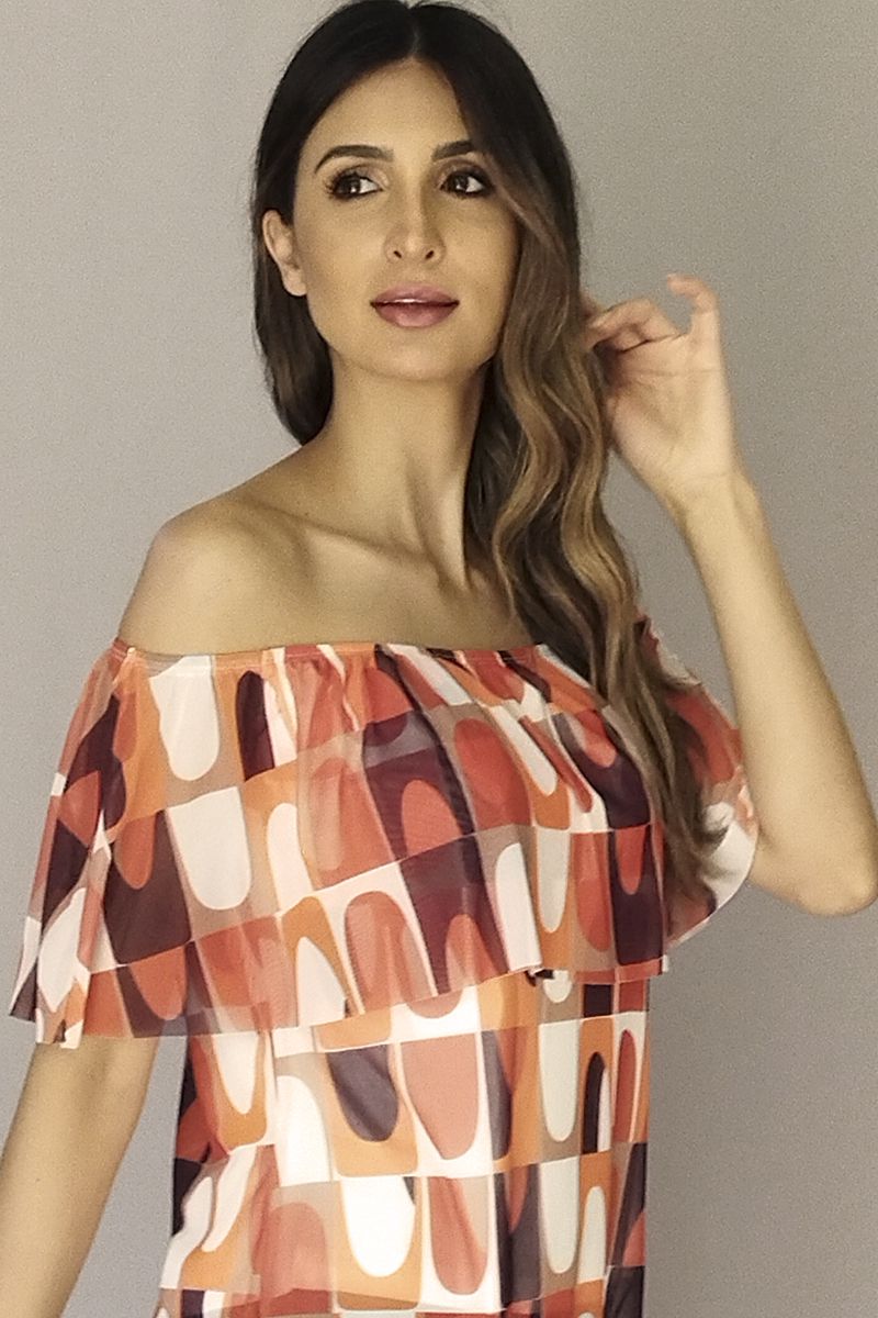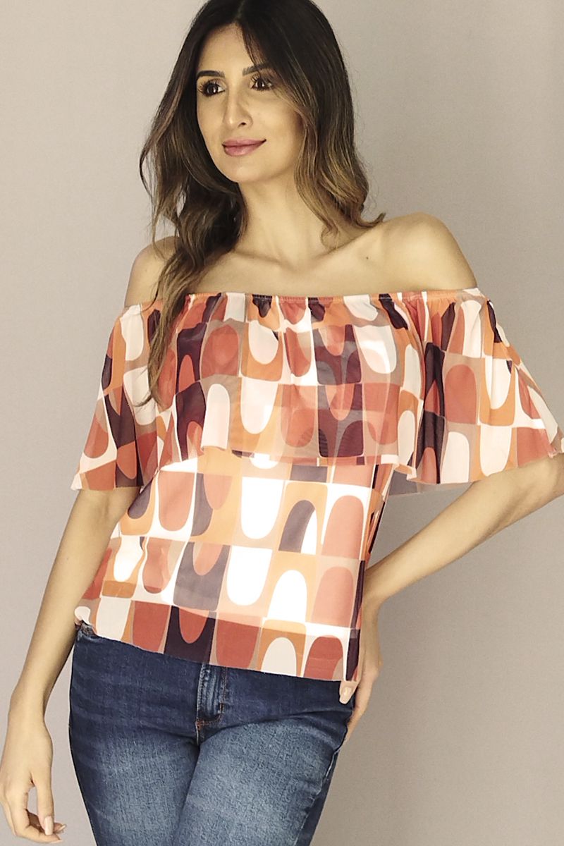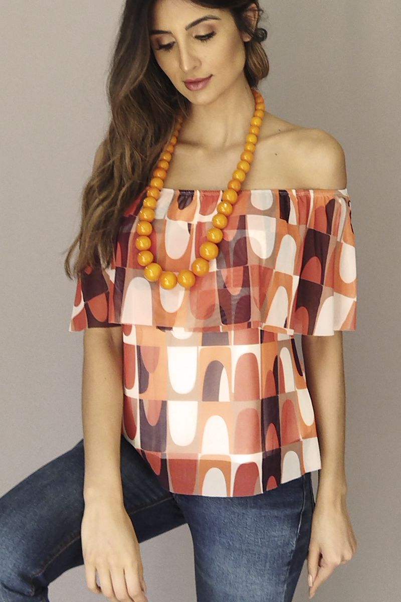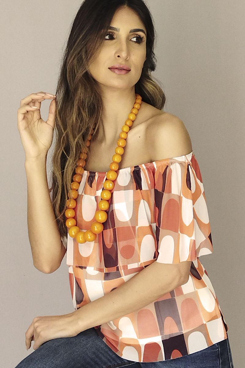 Blusa de tule sem alças, deixando os ombros à mostra, com lindo babado no decote