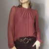 Blusa de tule cor pitaya com forro. Sutil detalhe franzido no decote e com mangas bufantes