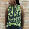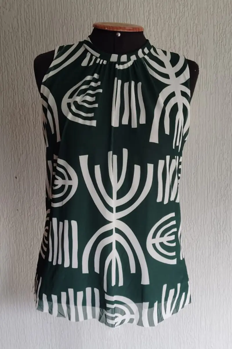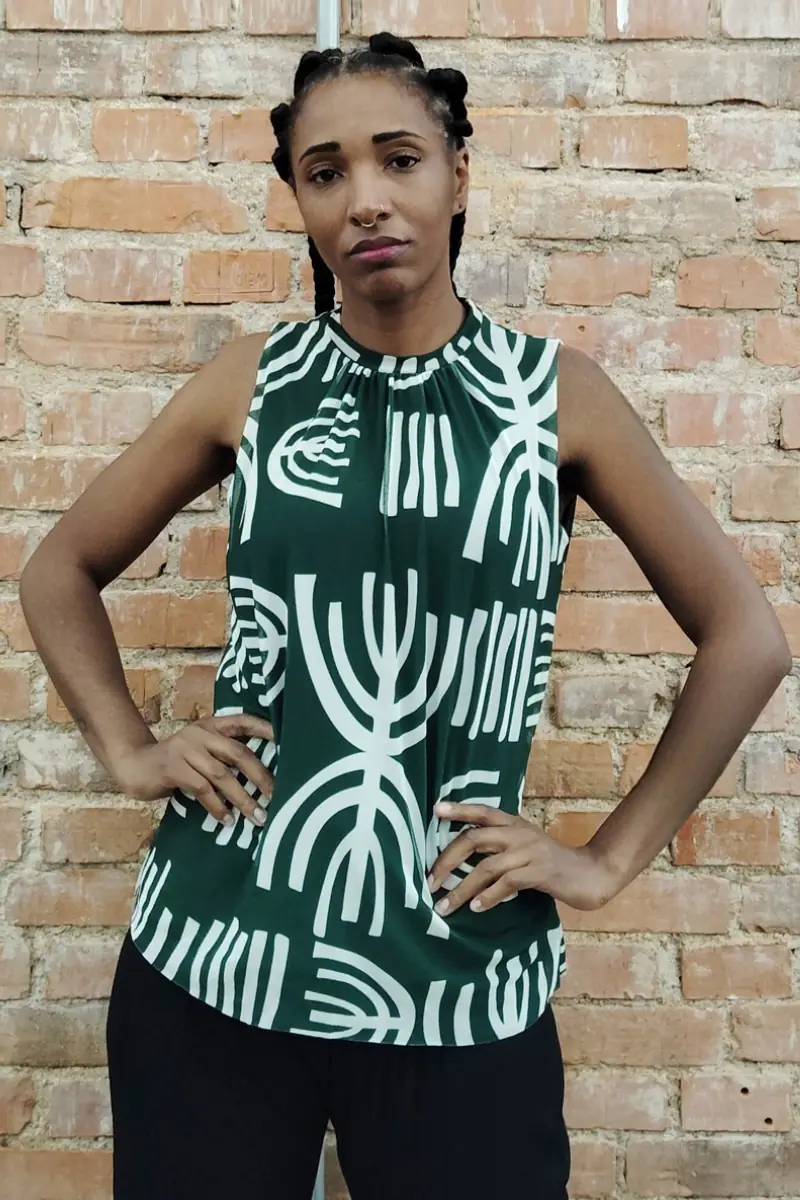 Blusa de tule estampada com manga cavada e decote franzido. Com forro.