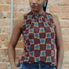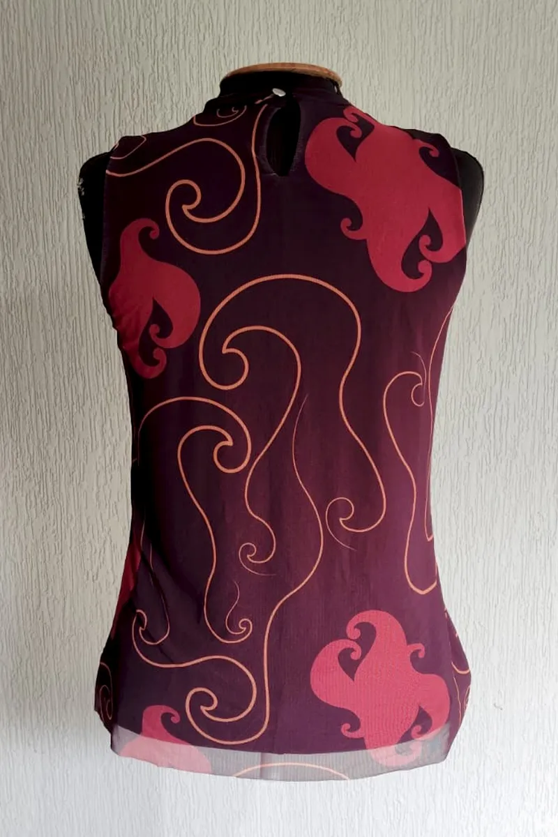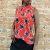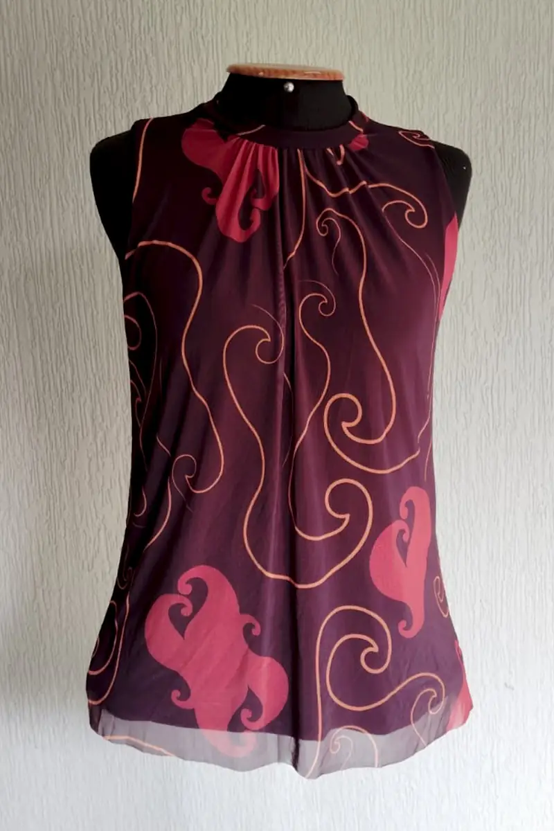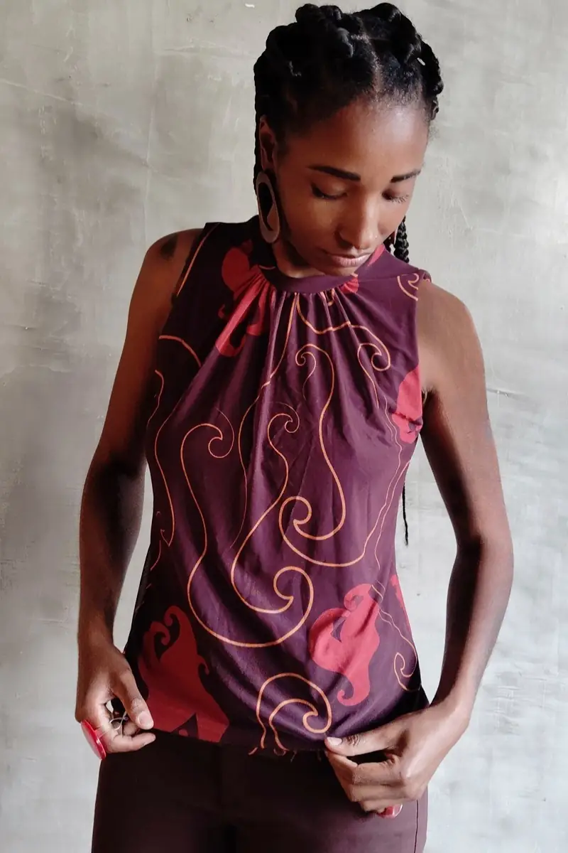 Blusa de tule estampada com manga cavada e decote franzido. Com forro.