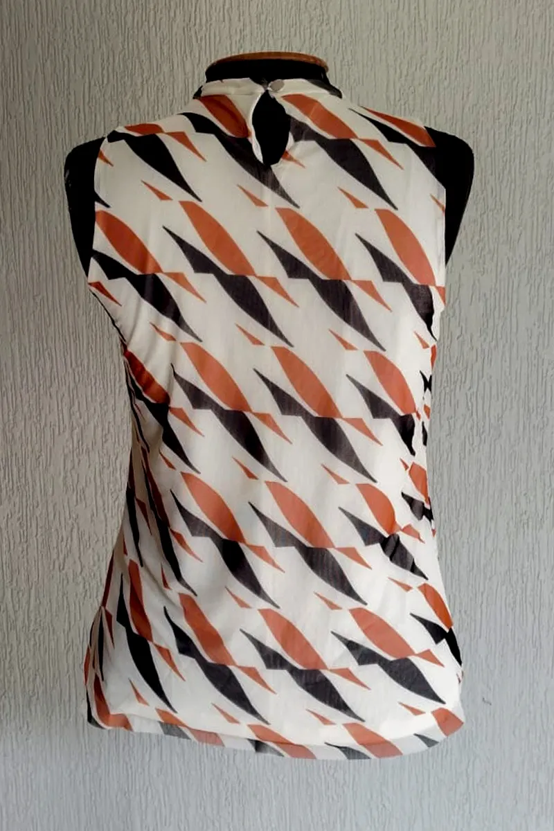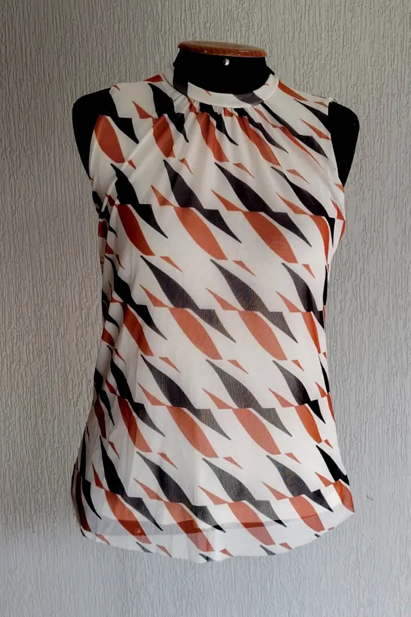 Blusa de tule estampada com manga cavada e decote franzido. Com forro.