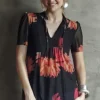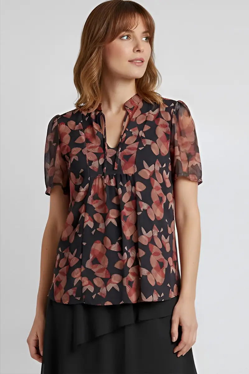 Blusa de tule estampada, manga curta, com gola e amarração na frente. Com forro