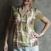 Blusa de tule estampada, manga curta, com gola e amarração na frente. Com forro