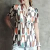 Blusa de tule estampada, manga curta, com gola e amarração na frente. Com forro