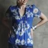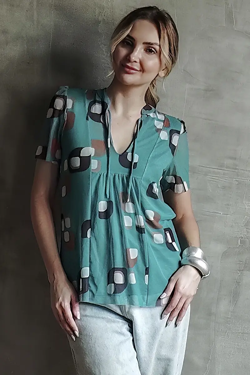 Blusa de tule estampada, manga curta, com gola e amarração na frente. Com forro