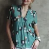 Blusa de tule estampada, manga curta, com gola e amarração na frente. Com forro