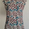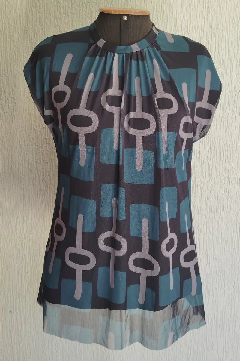 Blusa de tule estampada com manga japonesa, decote franzido com gola na frente e com forro.