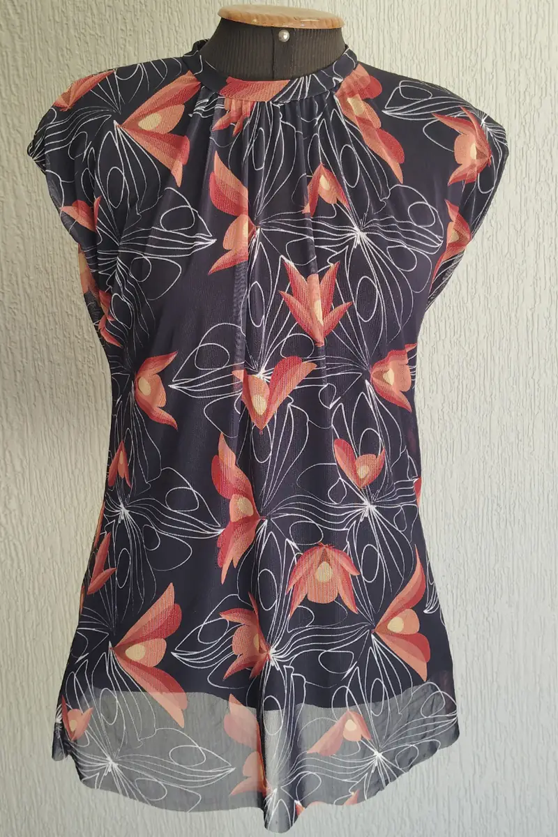 Blusa de tule estampada com manga japonesa, decote franzido com gola na frente e com forro.