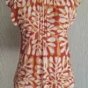 Blusa de tule estampada com manga japonesa, decote franzido com gola na frente e com forro.