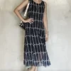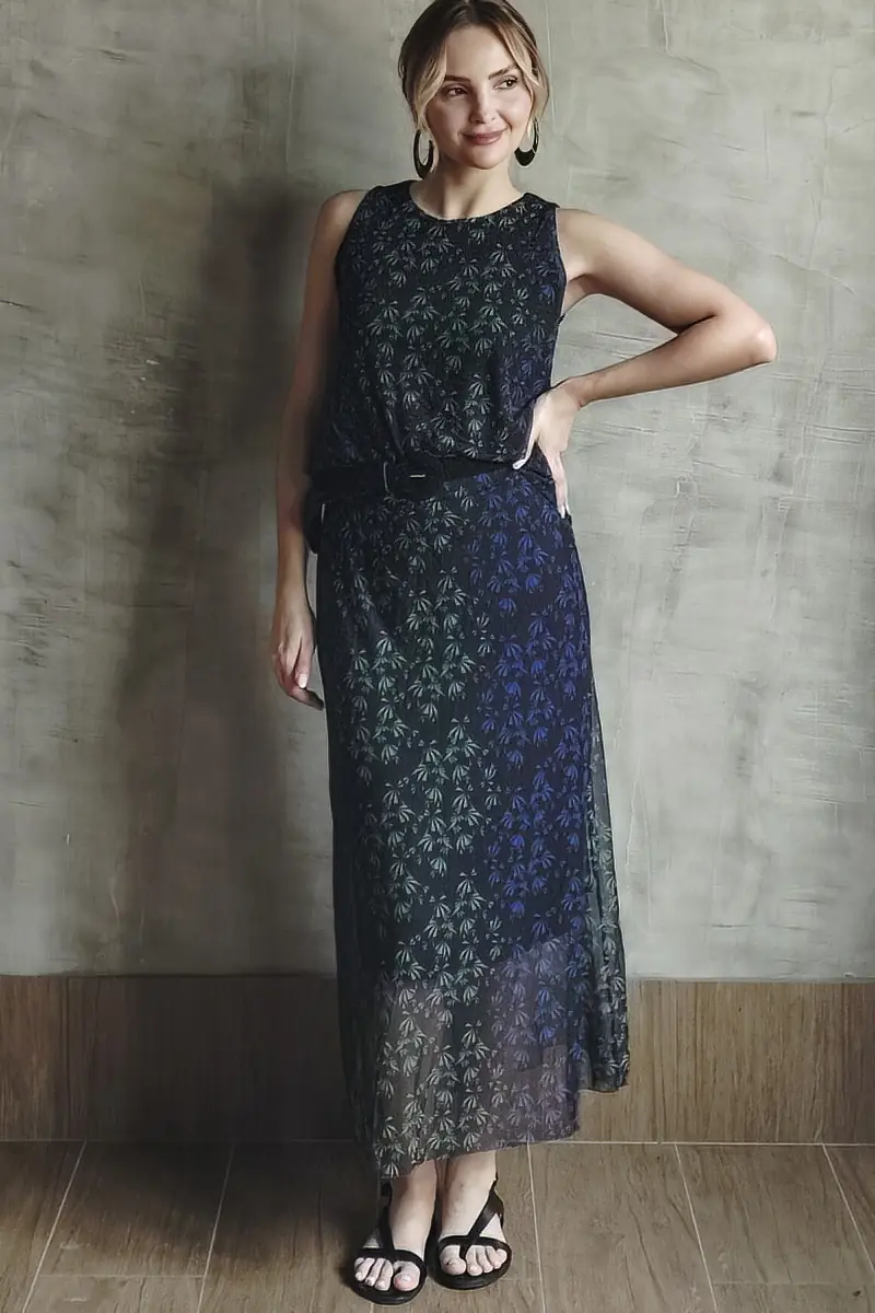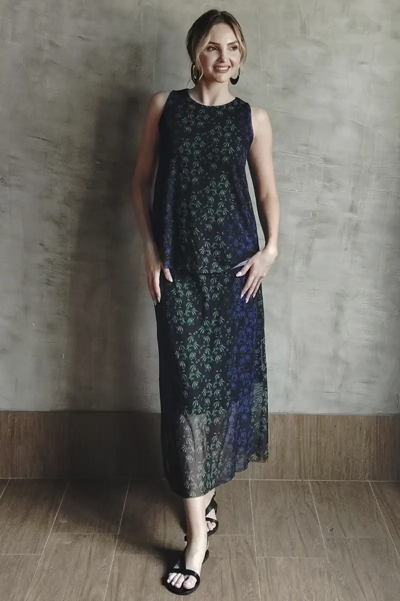 Conjunto blusa e saia, ambas peças de tule estampadas. Com forro.