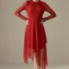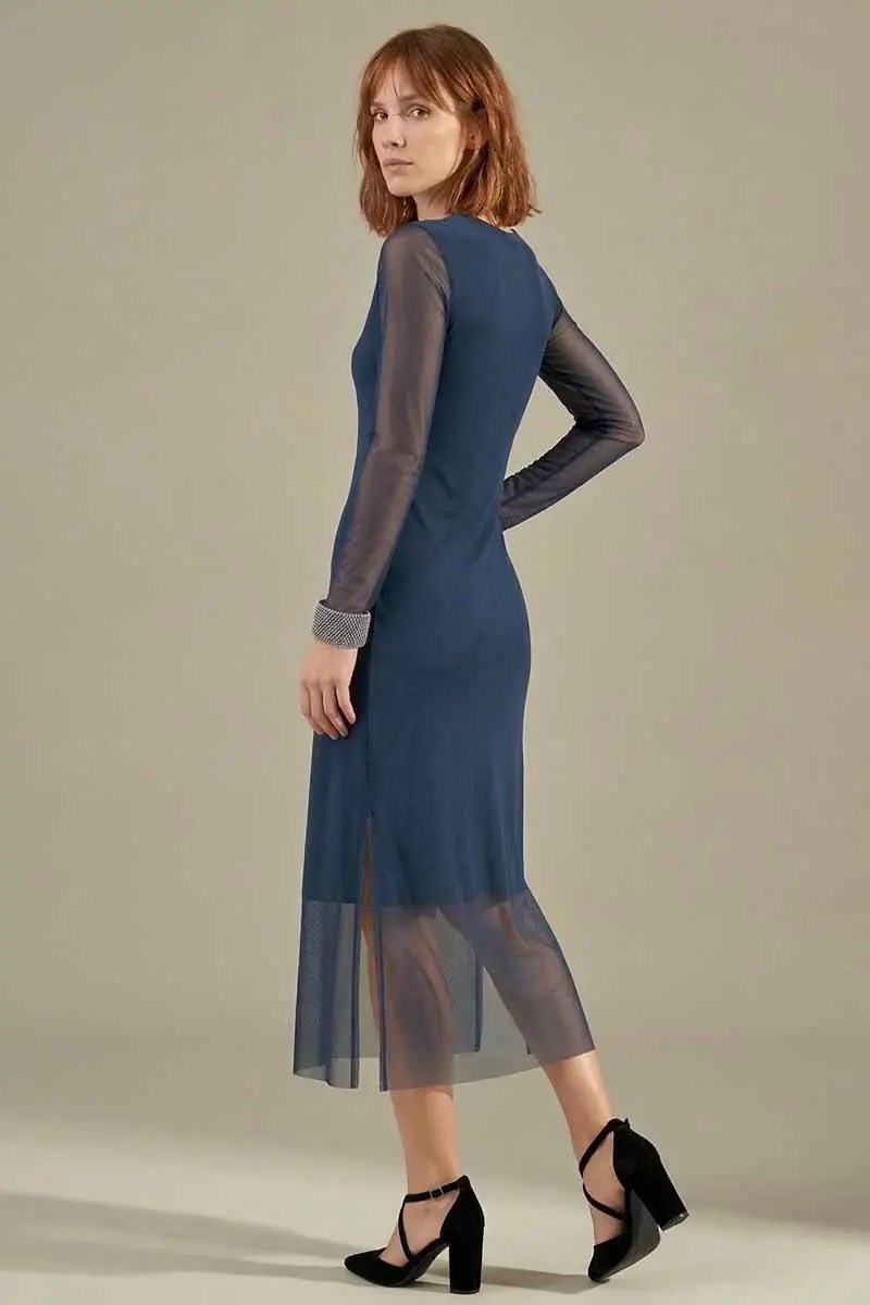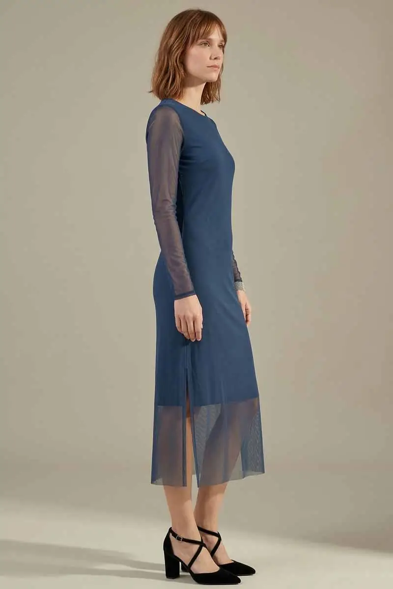 Vestido de tule cor azul oxford, acinturado, gola redonda e fendas laterais. Com forro.