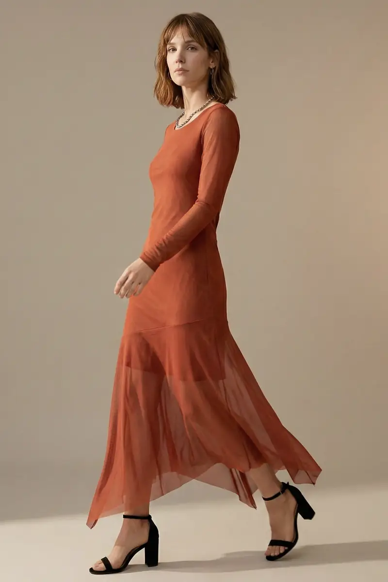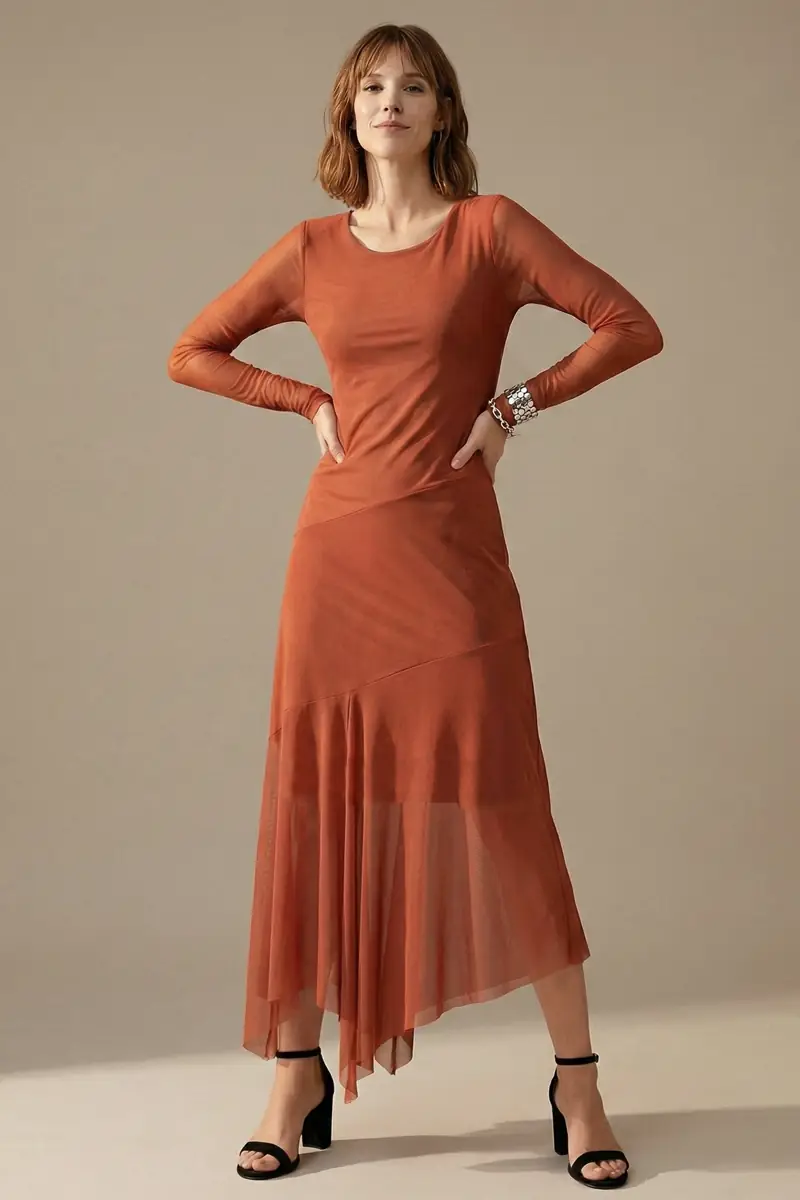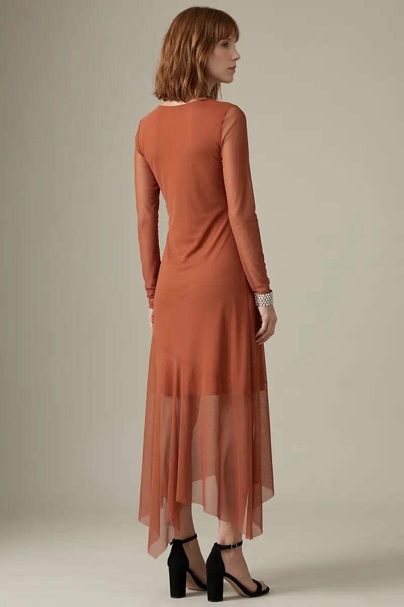 Vestido de tule cor argila manga longa, modelagem ajustada ao corpo, comprimento midi e com recortes assimétricos. Com forro.