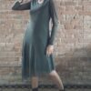 Vestido de tule cor verde oliva manga longa, modelagem ajustada ao corpo, comprimento midi e com recortes assimétricos. Com forro.