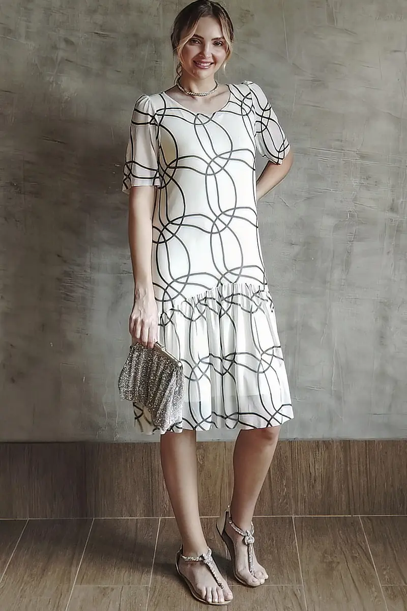 Vestido de tule estampado com corte amplo, decote redondo, mangas 3/4 bufantes com elástico. Com forro