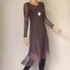 Vestido de tule cor argila, com modelagem assimétrica e recortes diagonais, acinturado e decote redondo. Com forro.