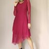Vestido de tule cor azul royal, com modelagem assimétrica e recortes diagonais, acinturado e decote redondo. Com forro.