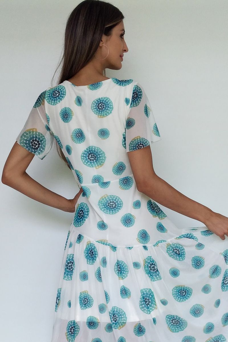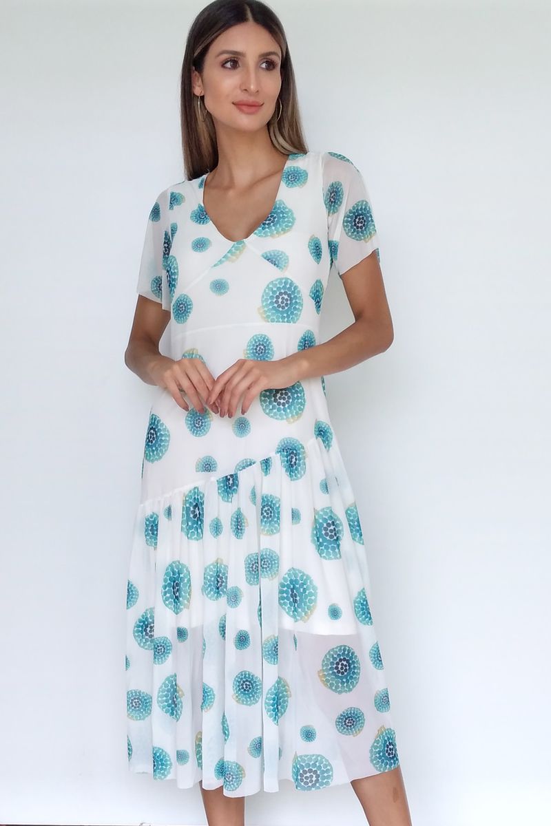 Vestido de tule com modelagem do busto tipo bojo, com forro e recorte transversal da saia com franzido