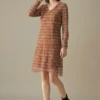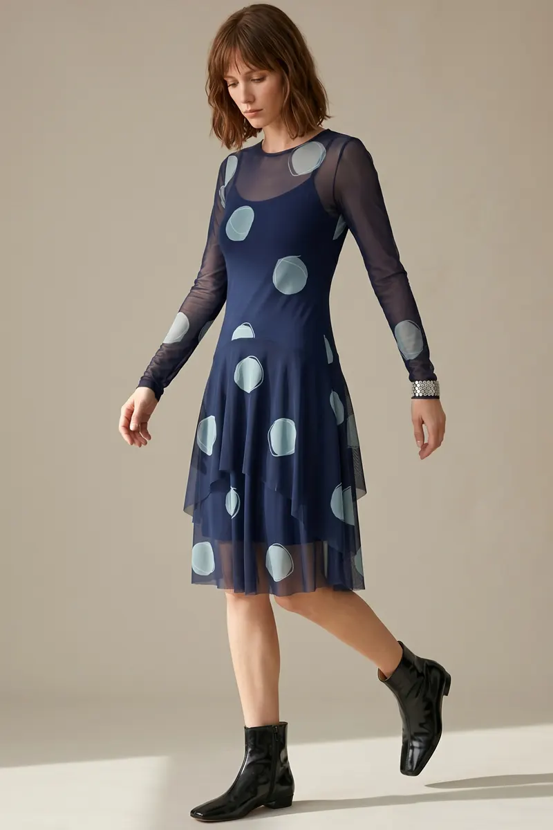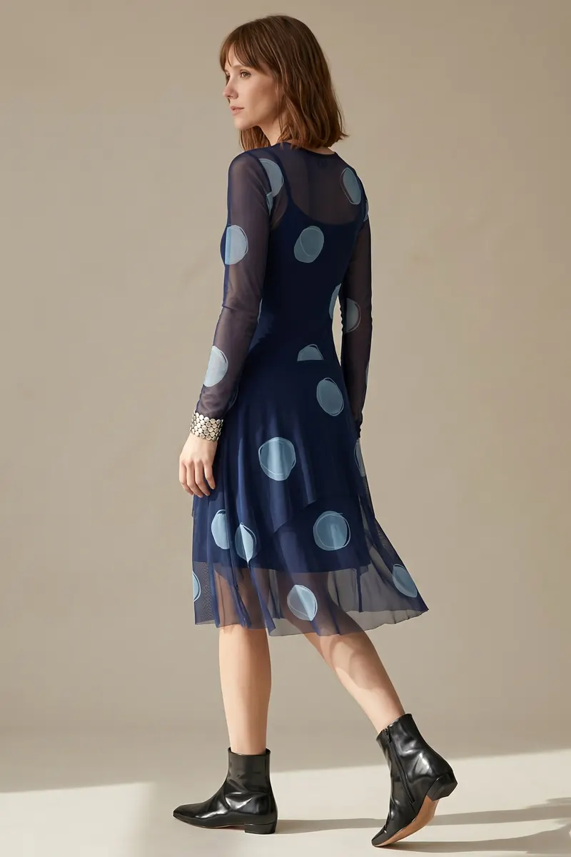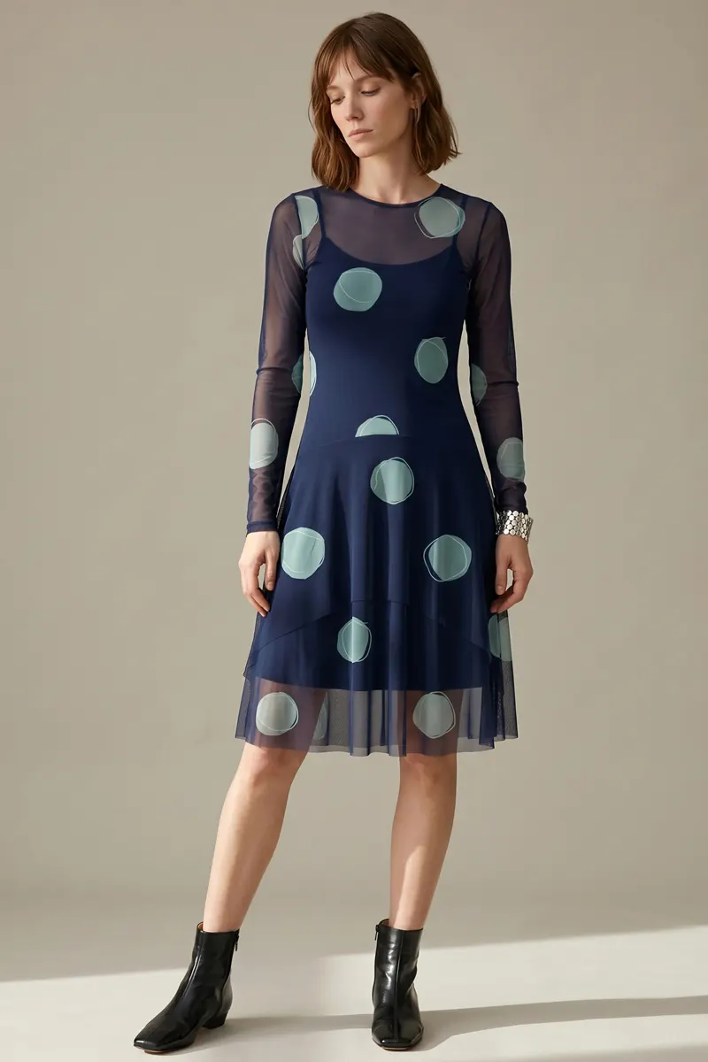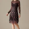 Vestido de tule estampado,comprimento curto, com decote redondo e detalhe da barra na altura do quadril. Acompanha anágua.