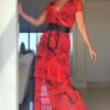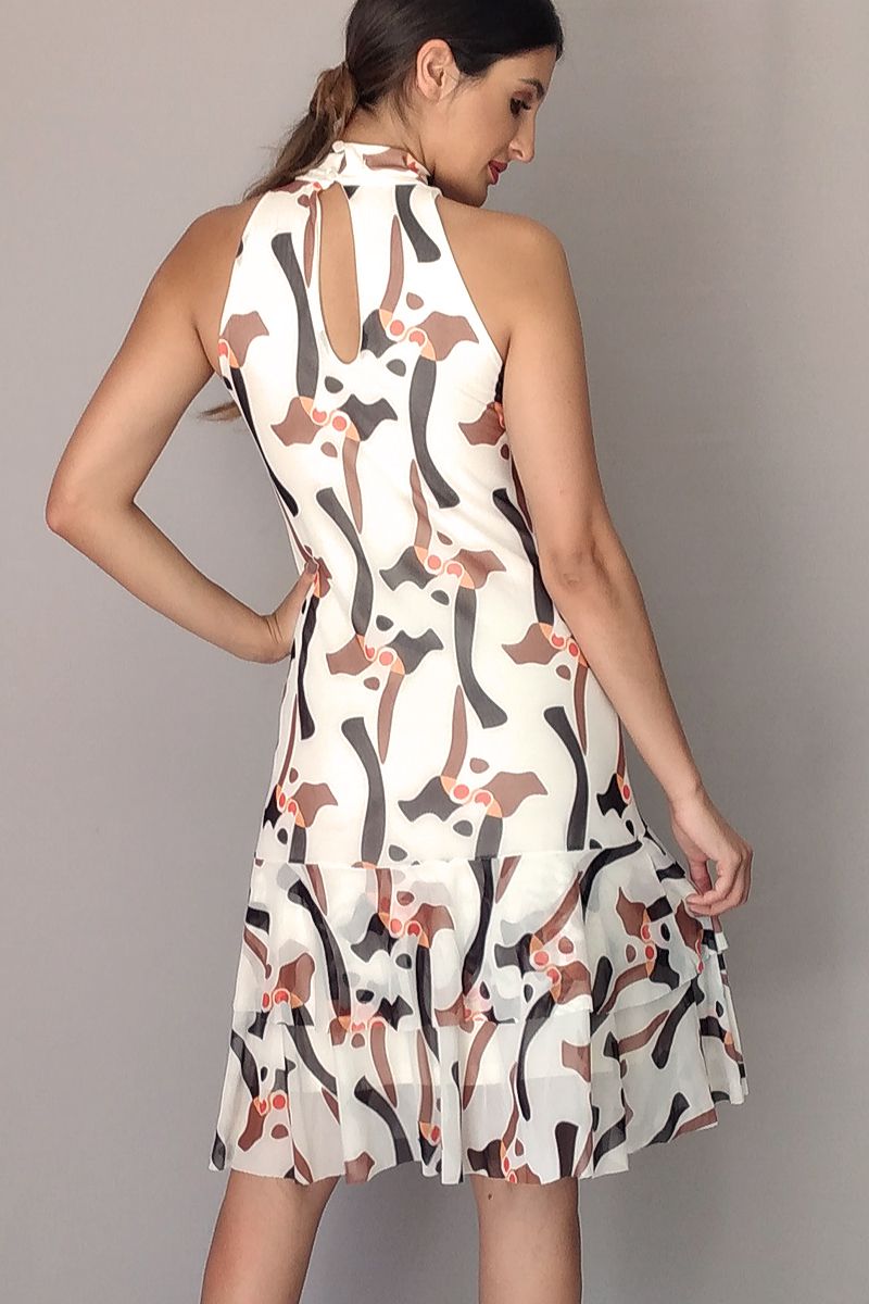 Vestido de tule com gola levemente alta e babado em duas 2 camadas.