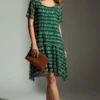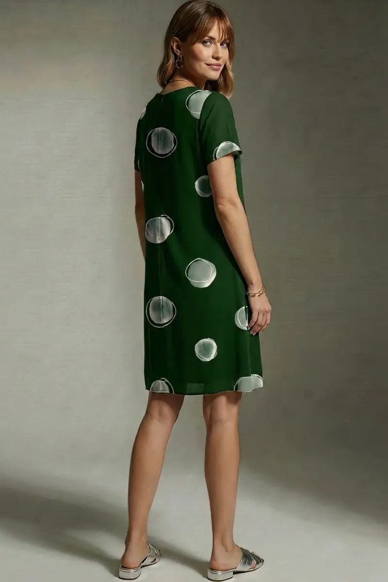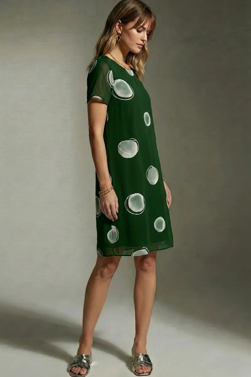 Vestido de tule estampado curto, decote redondo e recortes transversais no corpo Com forro.