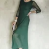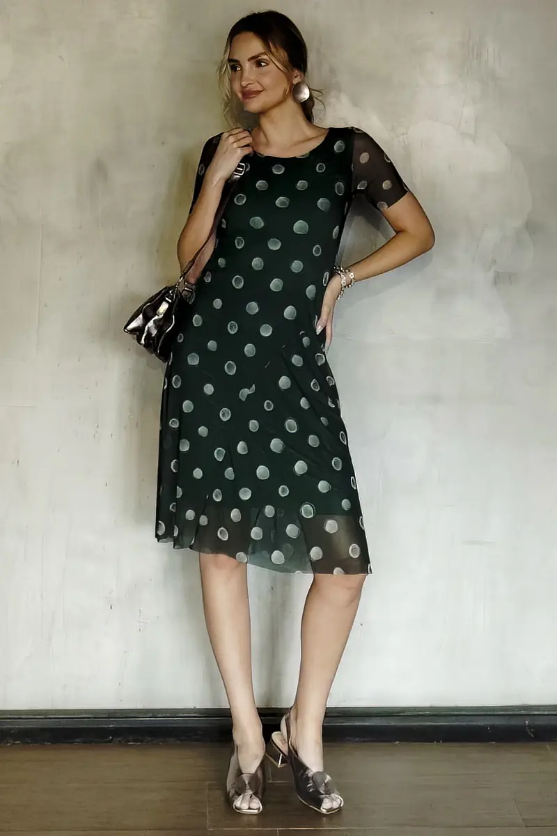 Vestido de tule estampado curto, decote redondo e recortes transversais no corpo Com forro.
