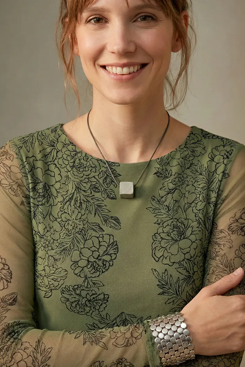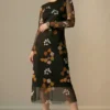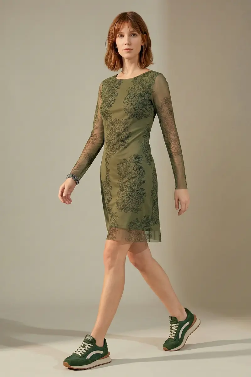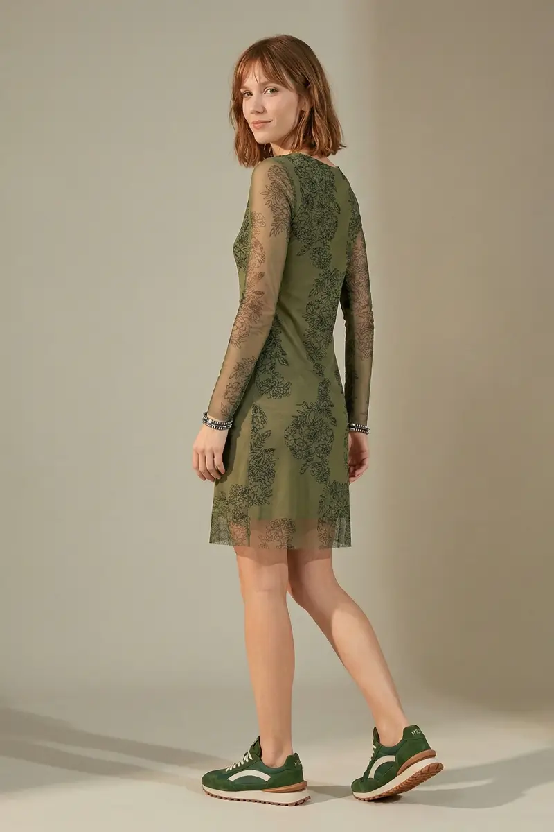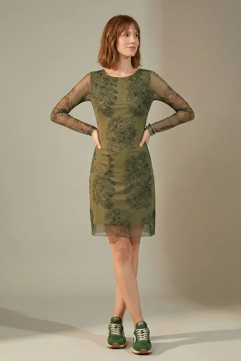 Vestido de tule estampado curto, decote redondo, manga longa e recortes transversais no corpo. Com forro.