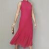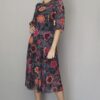 Vestido de tule estampado com nesgas, mangas bufantes e decote redondo. Sem forro