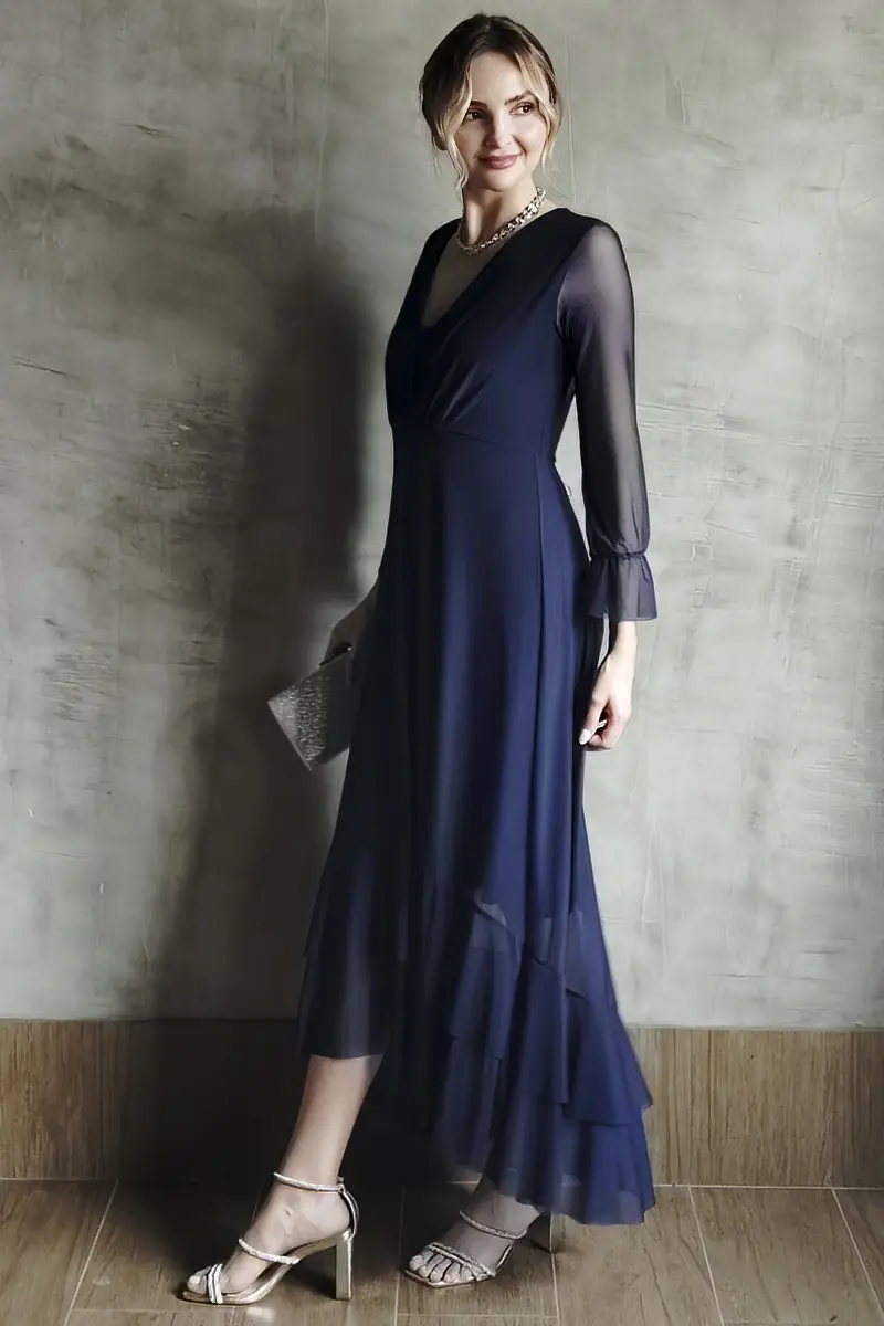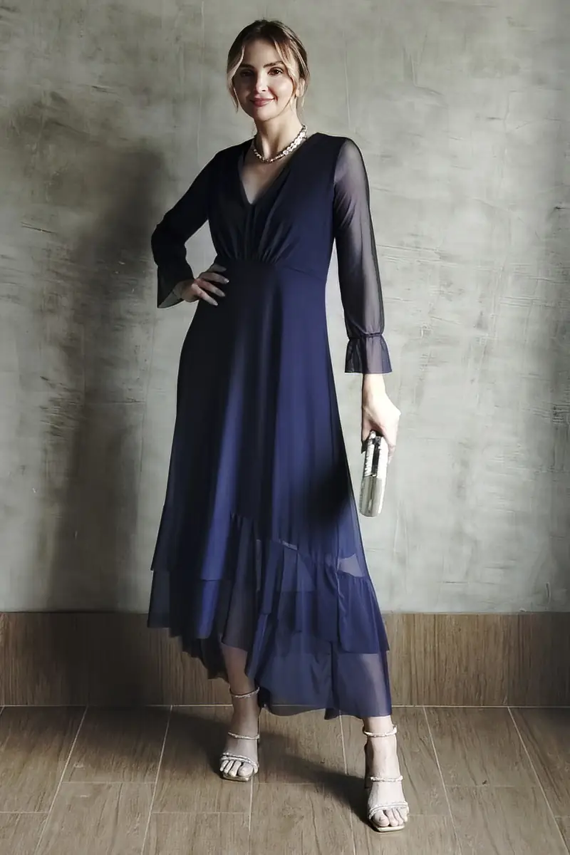 Vestido de tule decote V, drapeado abaixo do busto, babado duplo na parte de baixo e mangas 7/8. Com forro.