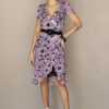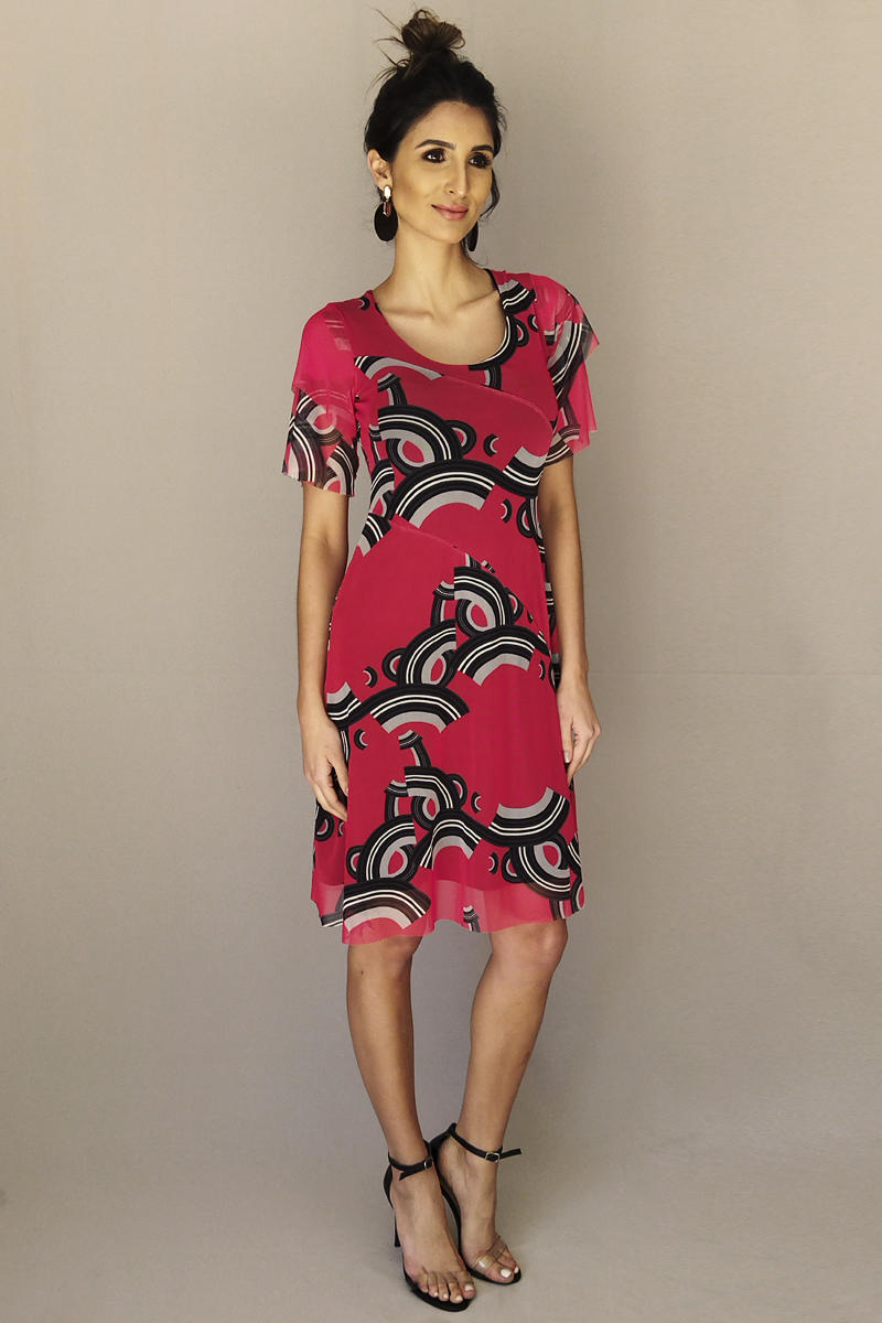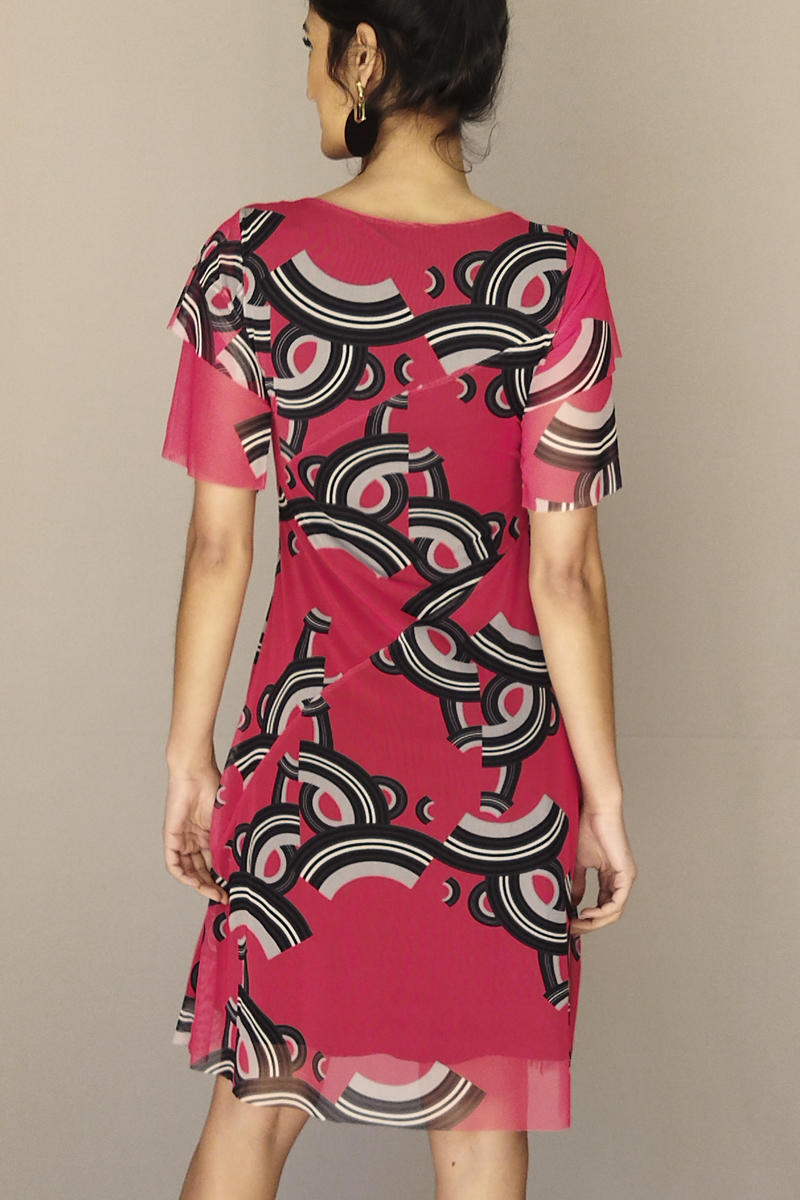 Vestido de tule em modelagem évasé com cortes diagonais no corpo e duas camadas de manga