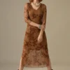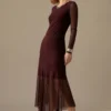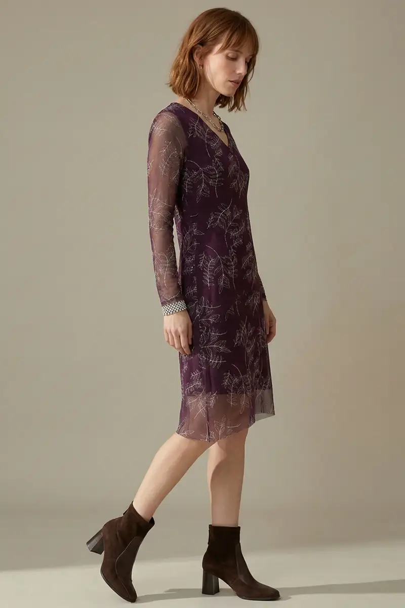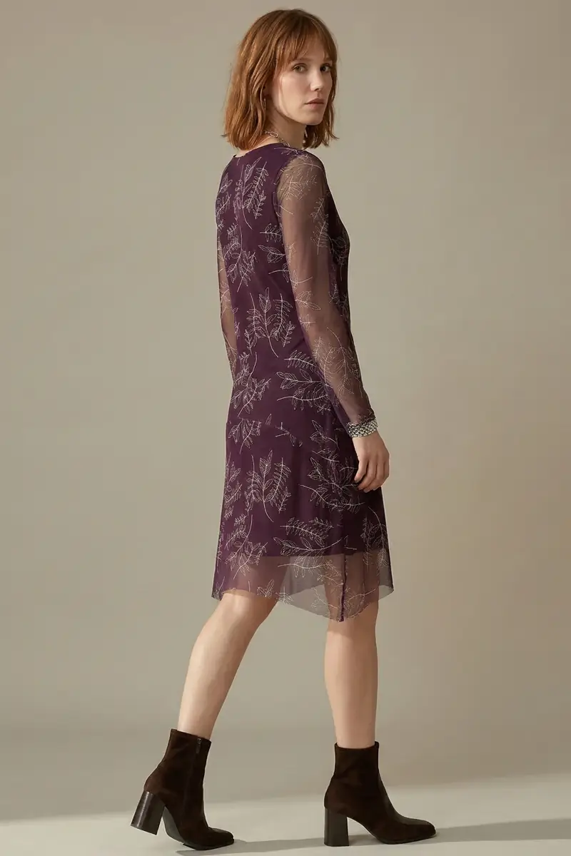Vestido de tule estampado manga longa com caimento evasê e detalhe na barra. Com forro.