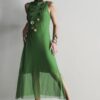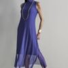 Vestido de tule cor pitaya, acinturado, corte em A, comprimento midi com fendas laterais, gola alta e sem mangas. Fechamento nas costas com botão. Com forro.
