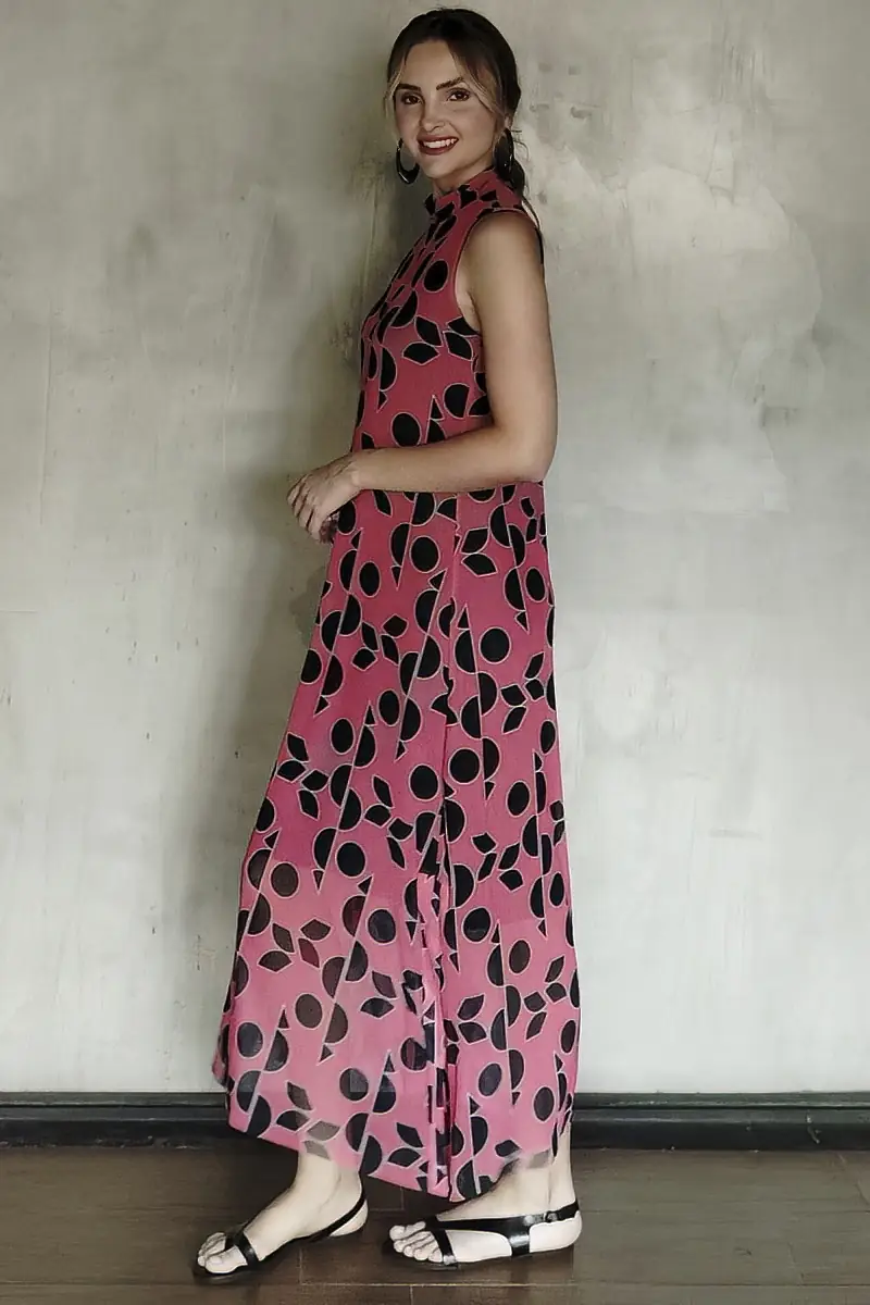 Vestido de tule estampado, acinturado, corte em A, comprimento midi com fendas laterais, gola alta e sem mangas. Fechamento nas costas com botão. Com forro.