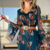Vestido longo de tule, transpassado e com forro em malha. Estampa étnica em tons de laranja e azul, sobre fundo preto.