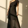 Vestido de tule maxi transpassado com forro. Parte da saia com dois babados godê proporcionando muita leveza e feminilidade