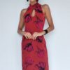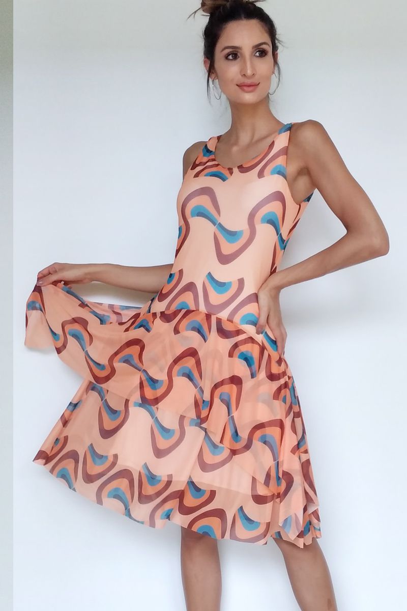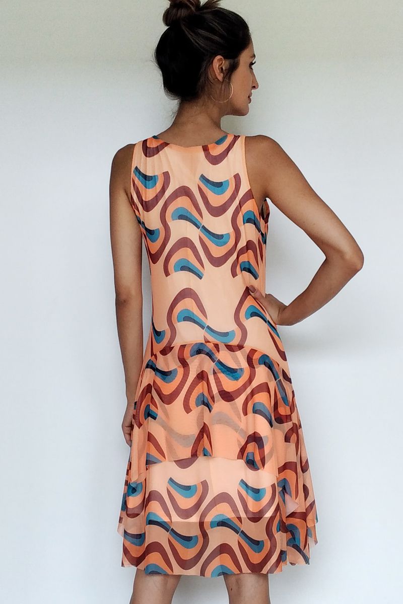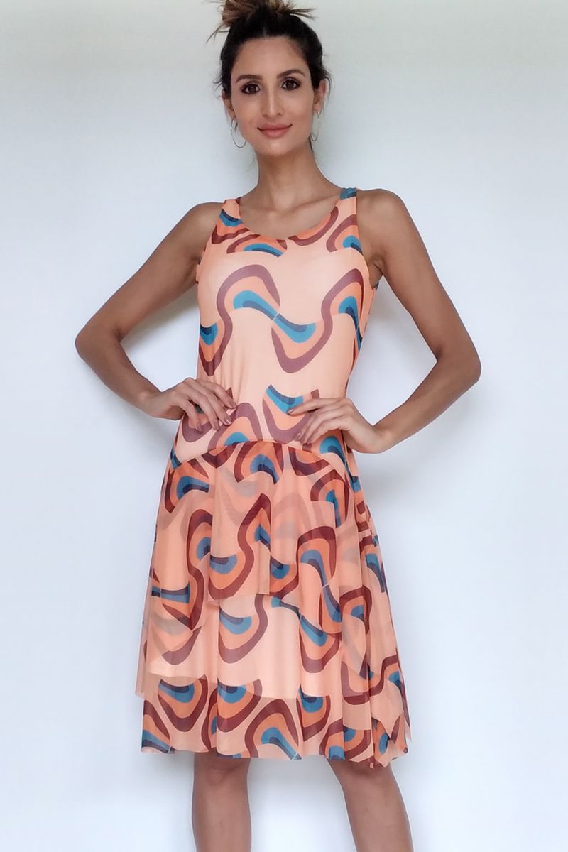 Vestido de tule estampado com manga cavada e camadas sobrepostas, privilegiando movimento e graça para este modelo. Com forro.