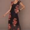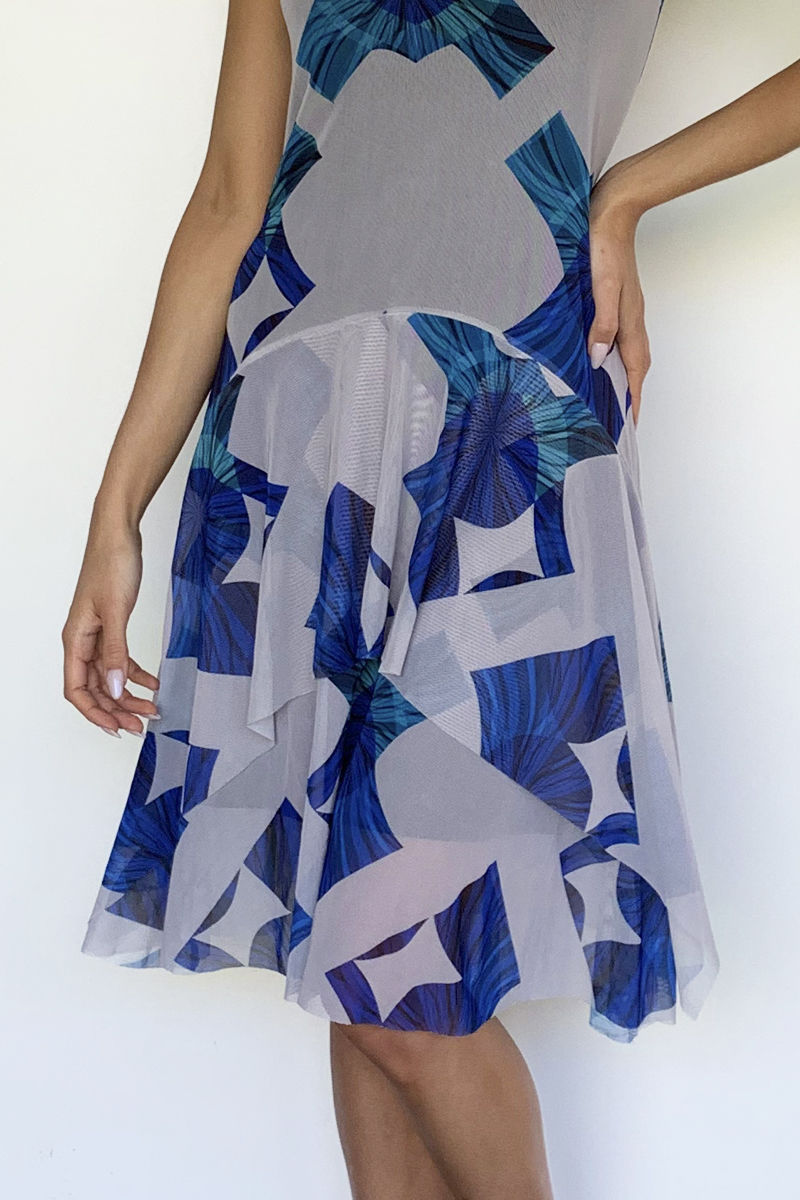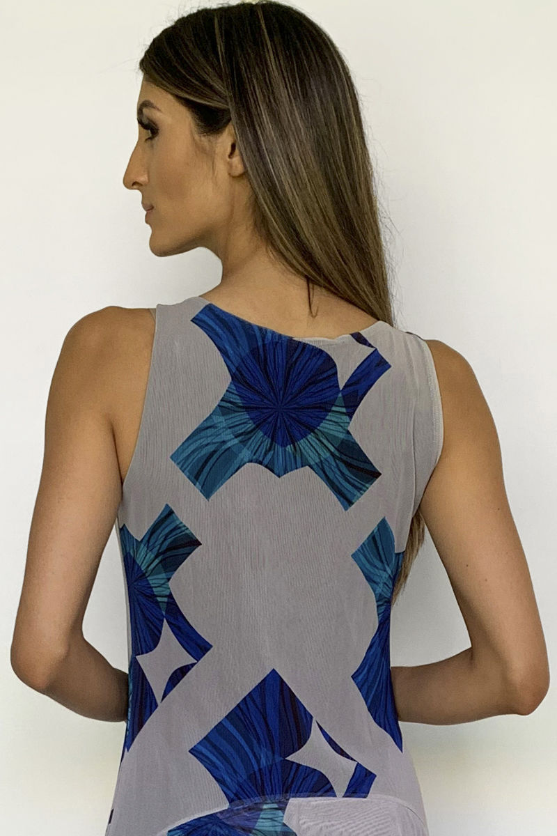Vestido de tule estampado com manga cavada e camadas sobrepostas, privilegiando movimento e graça para este modelo. Com forro.