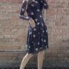 Vestido de tule estampado com forro e cortes tipo nesgas nas laterais e comprimento midi.