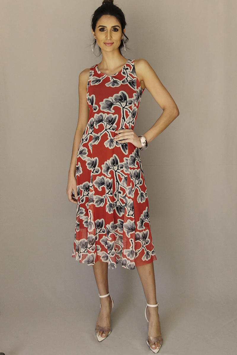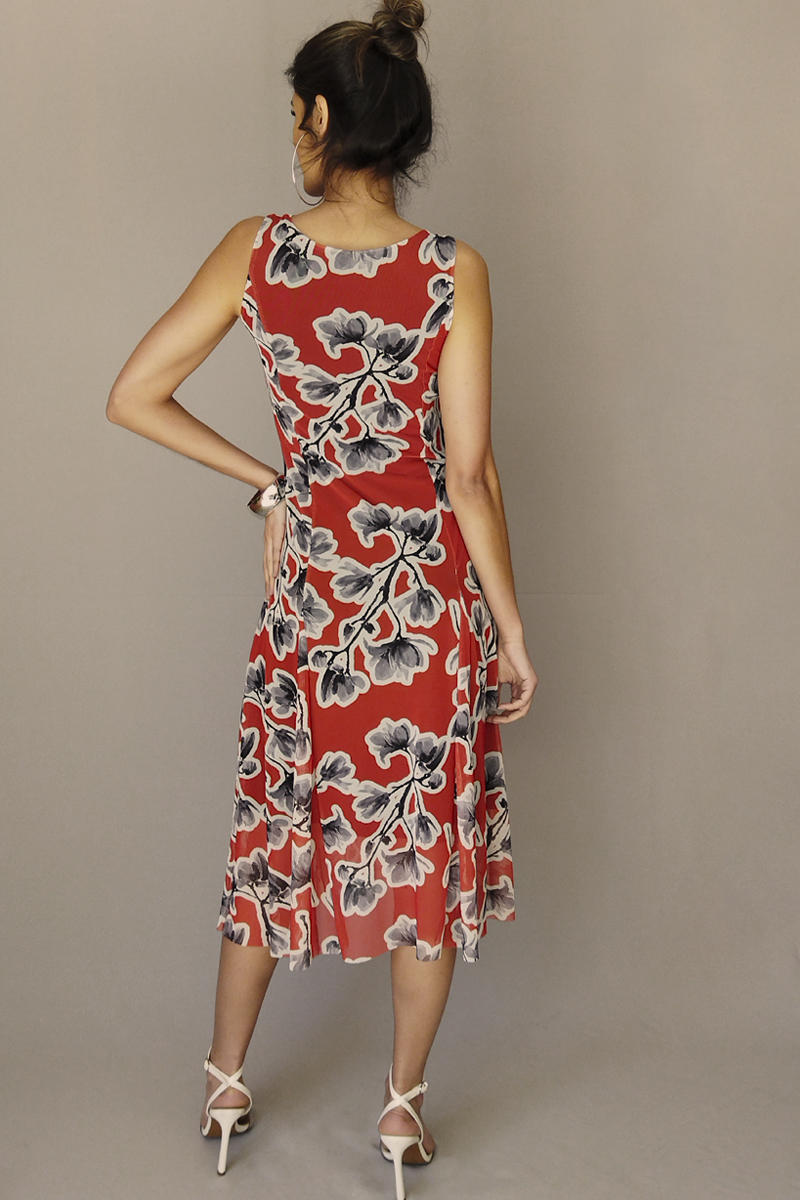 Vestido de tule estampado comprimento midi com cortes verticais e nesgas. Com forro. Parte da saia com caimento evasé.