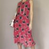 Vestido de tule estampado comprimento midi com cortes verticais e nesgas. Com forro. Parte da saia com caimento evasé.