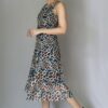 Vestido de tule estampado comprimento midi com cortes verticais e nesgas. Com forro. Parte da saia com caimento evasé.