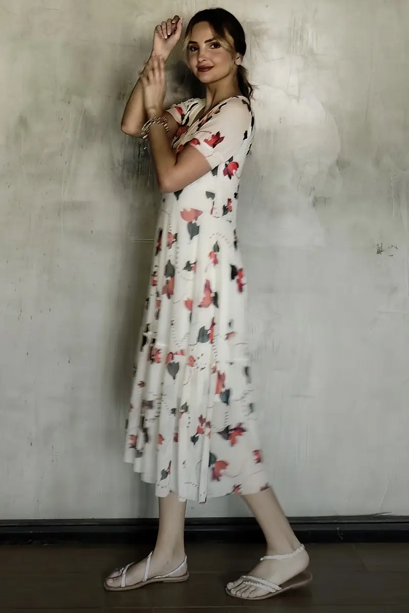 Vestido de tule estampado cor comprimento midi, decote V e manga levemente bufante. Com forro