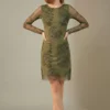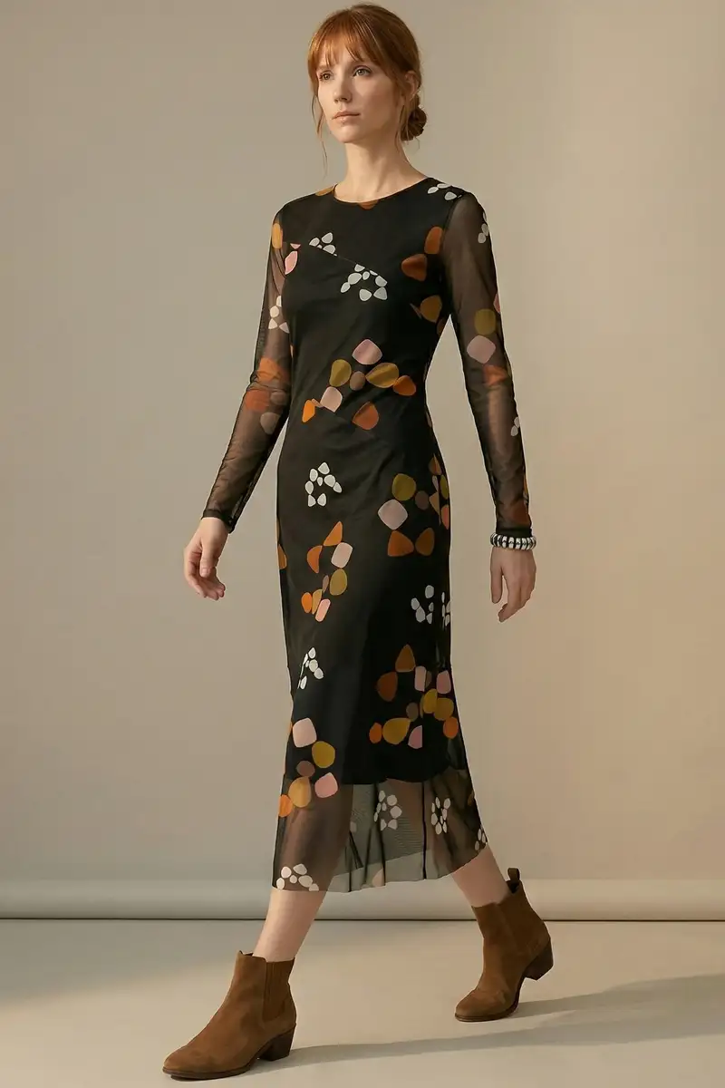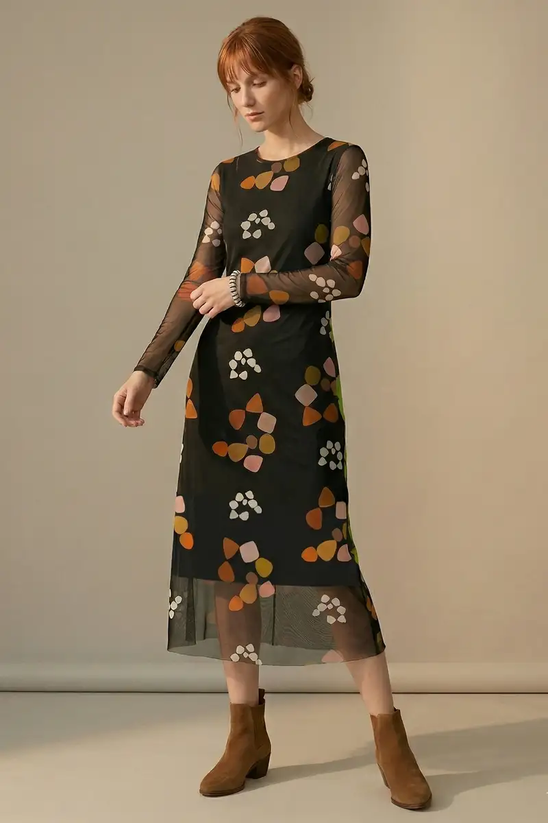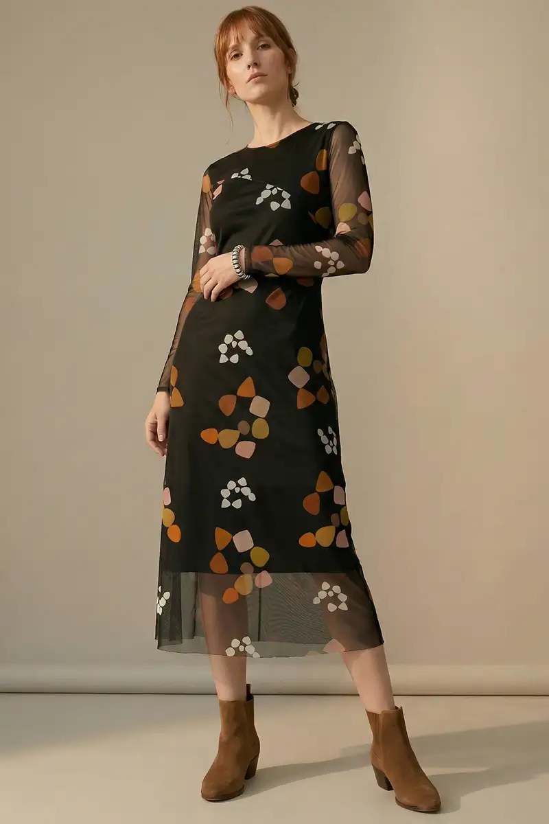 Vestido de tule estampado, modelo acinturado com decote redondo, recortes transversais no corpo e mangas ajustadas. Com forro.