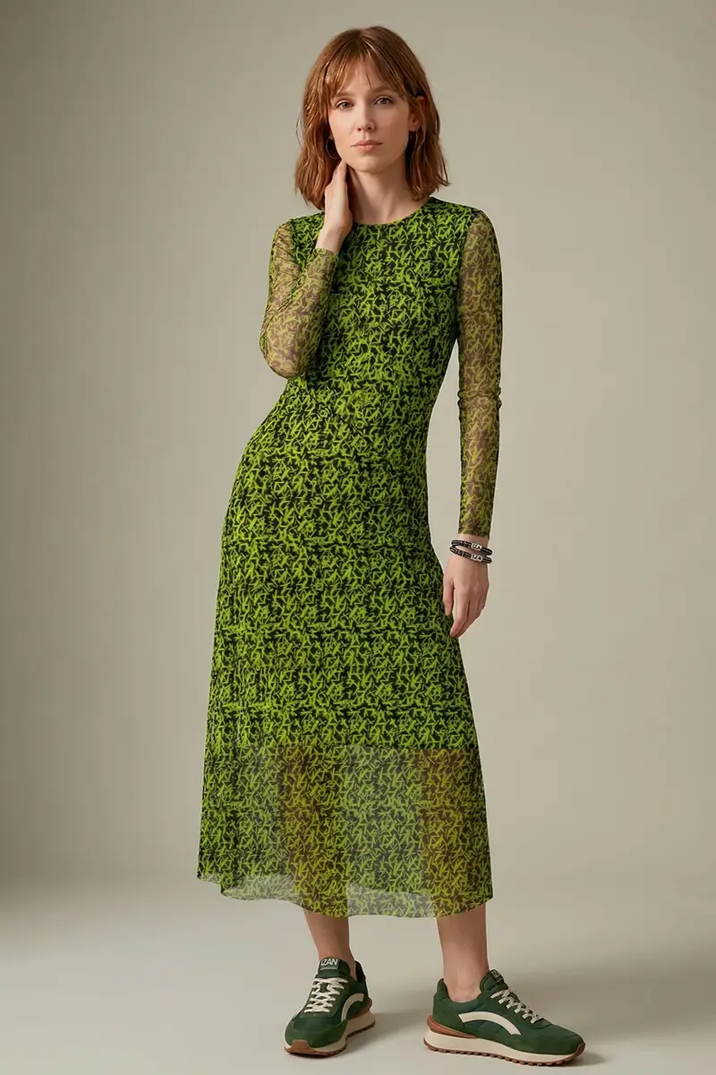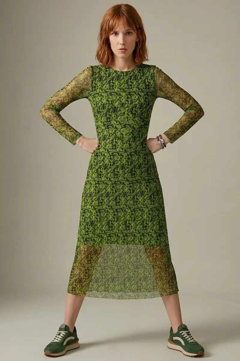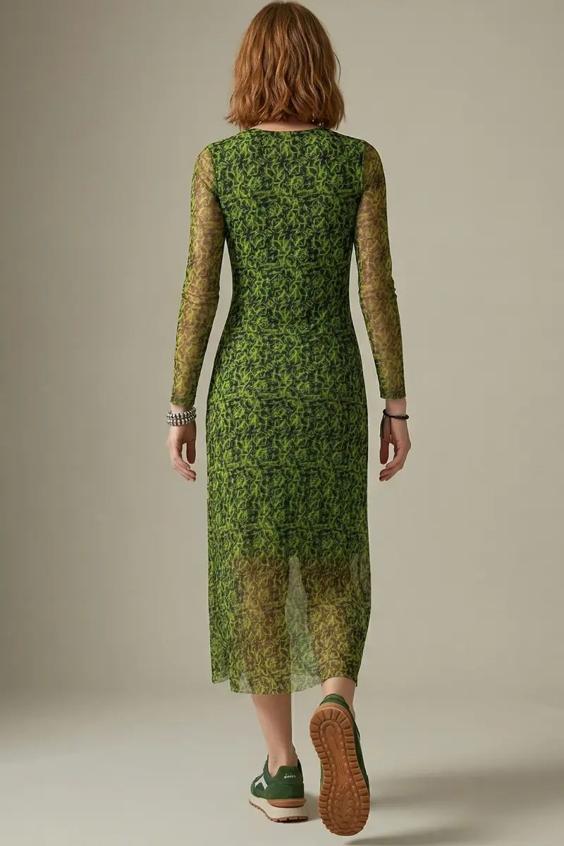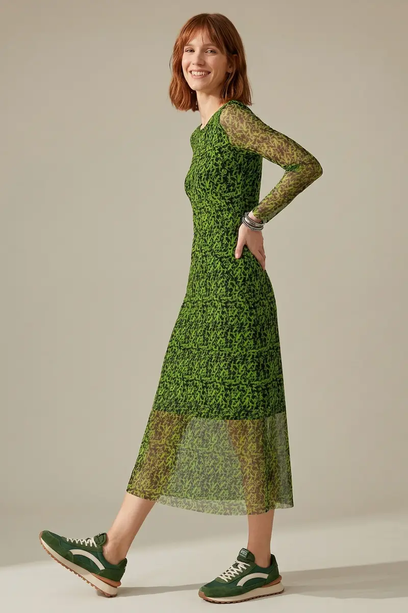Vestido de tule estampado, modelo acinturado com decote redondo, recortes transversais no corpo e mangas ajustadas. Com forro.