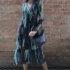 Vestido de tule estampado, acinturado com decote V fendas laterais e mangas 3/4 Com forro.