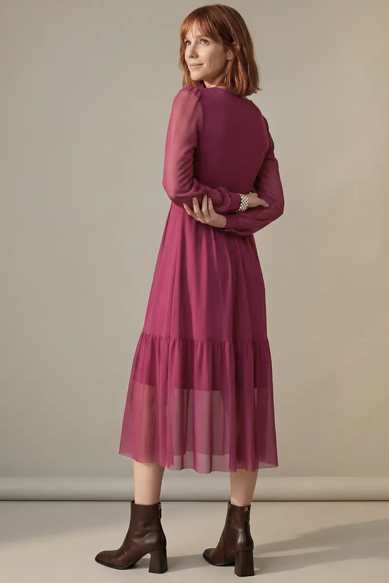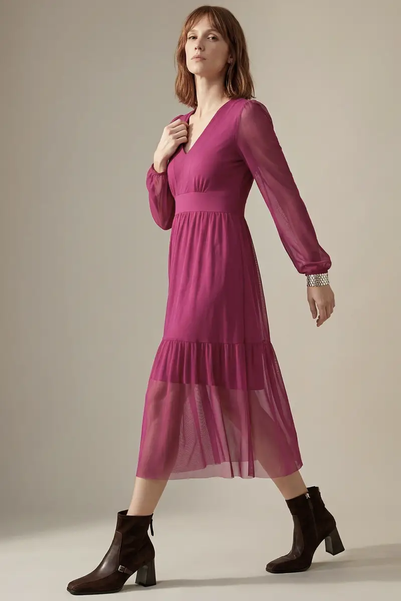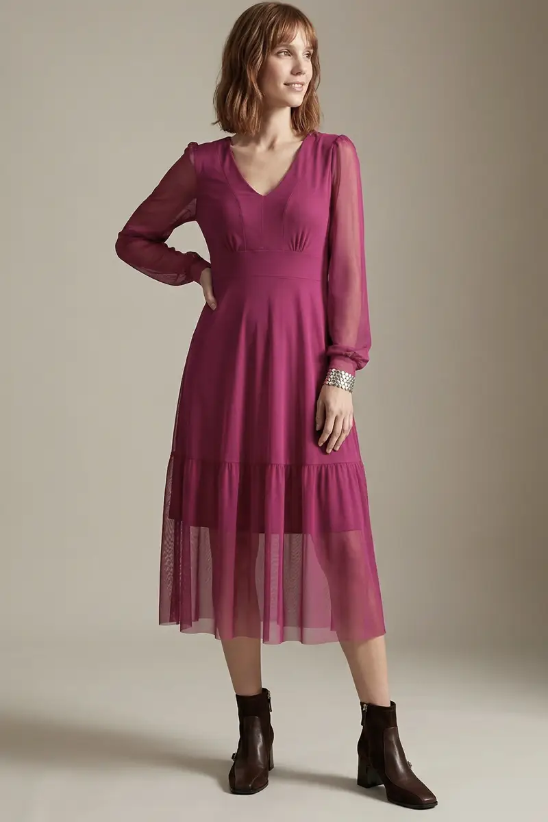 Vestido de tule cor pitaya com decote V e mangas bufantes. A parte da saia com Maria confere um toque especial. Com forro.